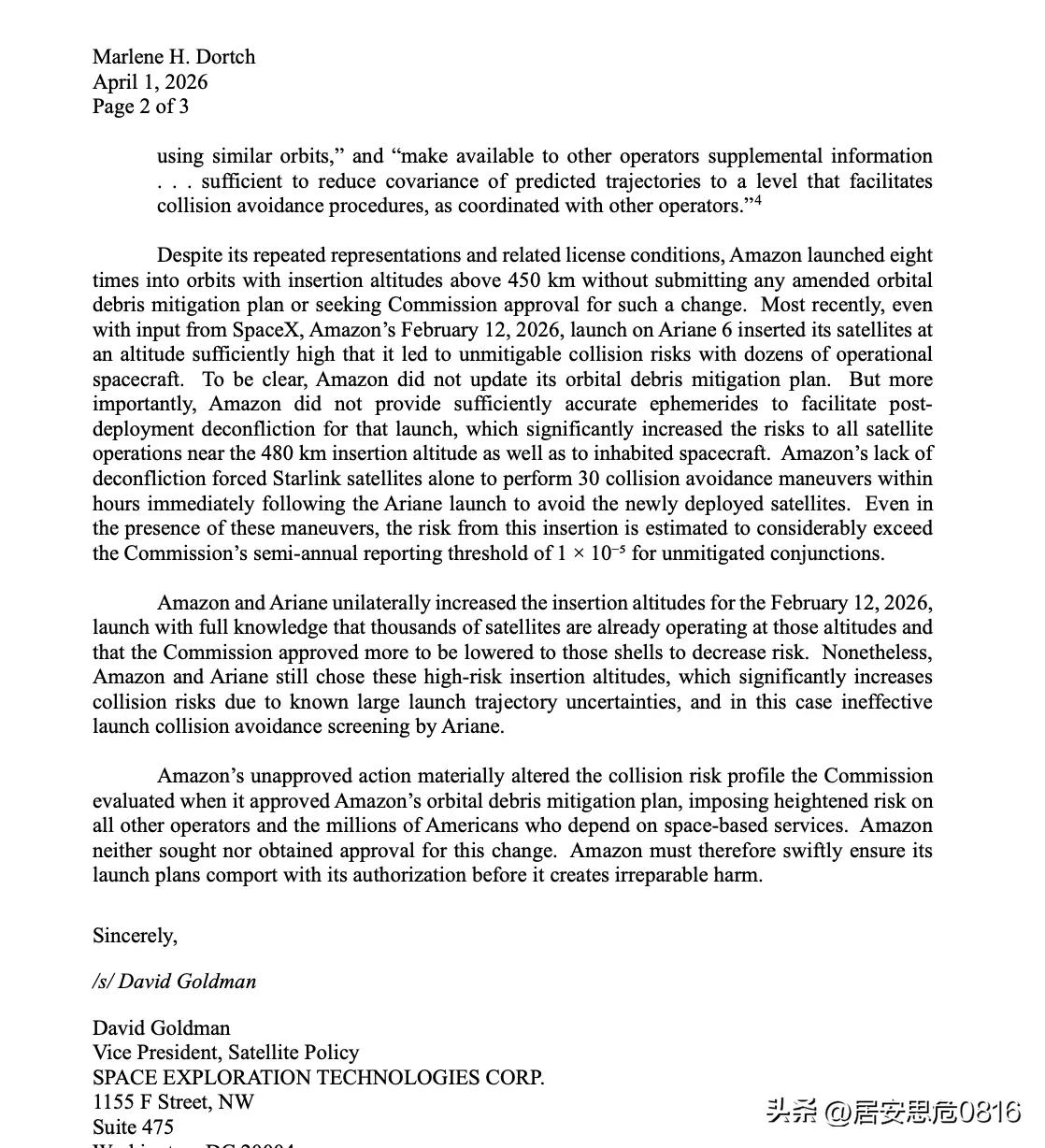 新闻:SpaceX 已向 FCC 提交一封信函,指控亚马逊继续违反其已获批准的轨道碎片减缓计划。 “亚马逊发射卫星的高度比授权高度高出50-90公里,且缺乏充分的协调和信息共享。亚马逊及其发射合作伙伴阿丽亚娜航天公司的疏忽大意,不必要地显著增加了其他运行系统和载人航天器的风险。需要明确的是,如果亚马逊和阿丽亚娜航天公司调整发射计划,使其符合亚马逊的授权要求,他们完全可以以显著降低风险的方式进行发射。” 信件全文: 亚马逊就不应该找欧猪发射🚀