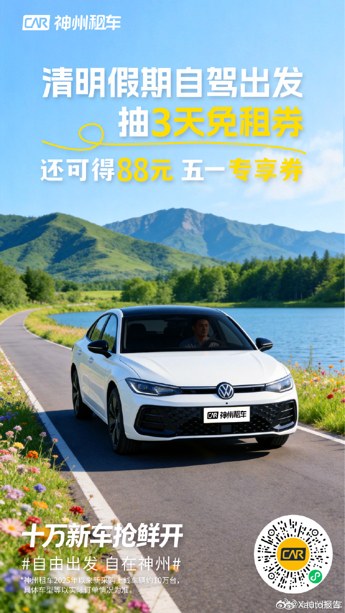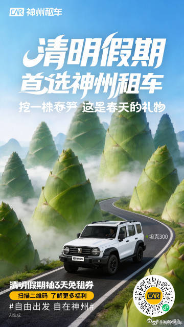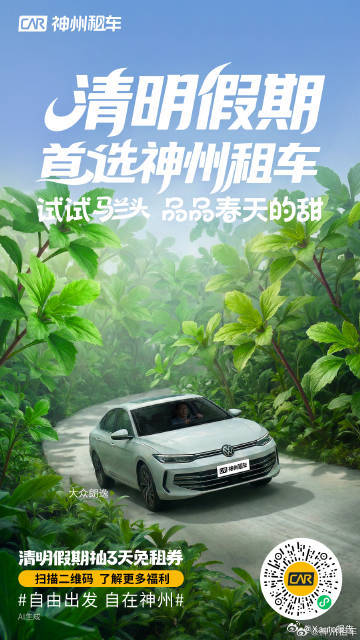 清明假期首选神州租车神州租车借春日与清明假期推广租车服务,以马兰头、春笋等春日风物烘托氛围,推出十万崭新车辆,邀用户驾车穿行江南、奔赴山野,畅享自在春光。自由出发 自在神州清明假期首选神州租车