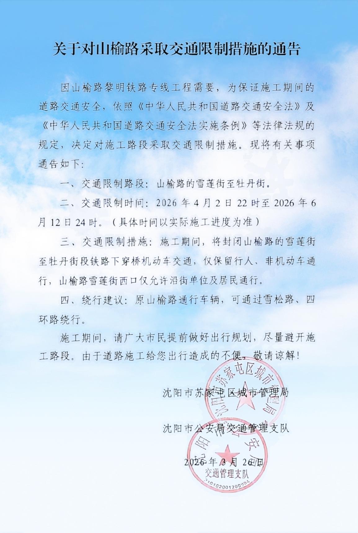 ⚠️沈阳苏家屯山榆路封闭施工!2个月出行必看 因黎明铁路专线工程施工,山榆路雪莲街至牡丹街段(铁路下穿桥) 即将封闭机动车通行! 📅 管制时间:2026年4月2日22:00-6月12日24:00(以实际施工为准) 🚗 管制措施: ✅ 仅保留行人、非机动车通行 ✅ 雪莲街西口仅允许沿街单位/居民通行 ✅ 社会车辆禁止通行 🔄 绕行路线:雪松路、四环路 施工期间请大家提前规划出行路线,错峰绕行,给您带来不便,敬请谅解! 沈阳交通# 苏家屯出行# 道路施工#