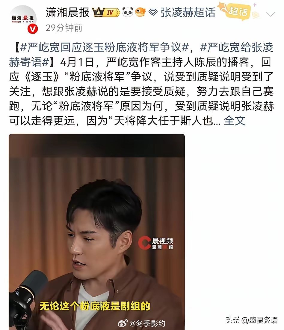 严屹宽,给张凌赫指了条明路!4月1日,严屹宽接受采访,面对“粉底液将军”争议他完全不回避,反而揭开最大痛点,并给出了一番很有深意的回应。他说,年轻人不管干哪行,都会被质疑,这其实是人生常态。被质疑恰恰说明你受到了关注。作为张凌赫在剧中的“舅舅”,他特意给张凌赫寄语,让他坦然接受质疑,努力和自己赛跑。严屹宽觉得,不管“粉底液将军”这事儿是剧组的问题,还是时代审美、市场需求的影响,质疑落到张凌赫头上,说明他能走得更远。就像“天将降大任于斯人也”,得先经历磨砺。他希望张凌赫守住演员的规范,好好珍惜这些经历,肯定能实现蜕变,成为厉害的演员。而且要抱着虚心的态度接受质疑,未来还有很多机会去慢慢改变。在《逐玉》里,严屹宽演的魏严是张凌赫演的谢征的舅舅,这层关系也让他的寄语多了份长辈对晚辈的恳切,这样的恳切之语,也的确为张凌赫的困境指了一条明路。