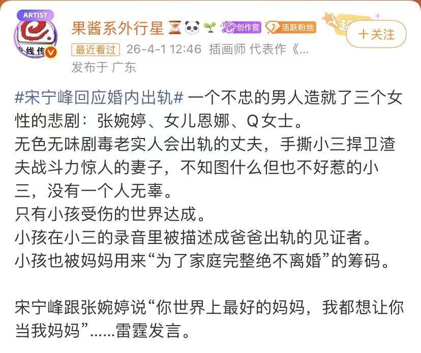 好吧,原来宋宁峰事件是这样的瓜 这男人看起来是挺老实的 怎么也出轨 果然男人只有挂墙上了才会老实 可怜了妻子 可怜了女儿 怎么摊上这样一个丈夫,父亲 出门约小三 还把女儿放隔壁屋 真的是离了个谱 是一点也不怕女儿会受此影响 果然人有时候为了自己的欲望 啥事都能干 话说这男人以前还跟周迅谈过 还好周公子理智 跟他分手了 不然也是惹得一身骚 男人既然结婚了 就该好好管住自己的下半身 这样才是对自己,对家庭负责任