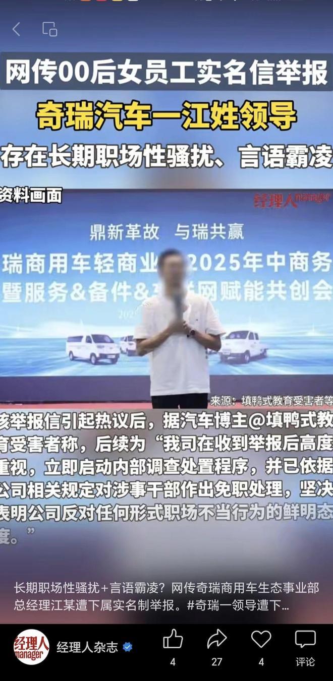00后勇揭职场丑行,45岁高管自食恶果 4月1日,奇瑞商用车00后女员工实名举报45岁高管性骚扰一事冲上热搜,职场权力越界的丑态再度引发全网声讨,这般仗势欺人的行径,怎能不让打工人愤慨? (个人观点仅供参考,无任何不良引导) 常言道“上梁不正下梁歪”,这位45岁高管江某某早已是劣迹斑斑。已婚育有成年子女,身居管理职位却毫无德行,全然忘了职场尊卑与道德底线,把手中权力当成肆意妄为的资本。今年1月起,他便将魔爪伸向这位初入职场的00后女孩,微信消息满是暧昧言辞,亲昵表情接连不断,女孩刻意疏远冷处理,他反倒变本加厉,凌晨时分频频拨打微信电话,扰得女孩寝食难安、惶恐终日。办公场所内更是肆无忌惮,动手触碰女孩脸部手部,举止轻佻令人作呕,还随意使唤女孩做刮胡子、刷茶杯等私人事宜,专横跋扈之态尽显,全然一副职场土皇帝的做派。更让人唏嘘的是,此前已有其他员工举报其骚扰行为,他非但未受惩戒,反倒一路升迁,这般纵容更是让他有恃无恐,将公司规章视作无物。 初入社会的00后女孩,怀揣职场理想却身陷阴霾,面对位高权重的上司,多少人会选择忍气吞声?可她偏不,柔弱身躯藏着满满勇气,不愿任人宰割,不愿让恶行继续隐匿。3月28日,她毅然拿起实名举报的武器,将高管的龌龊行径全盘托出,不向恶势力低头,这份果敢,值得所有人点赞。试问职场之中,有多少受害者敢这般直面强权?又有多少人在隐忍中受尽委屈? 奇瑞公司的反应堪称迅速,未做丝毫推诿。接到举报后即刻成立专项组核查,铁证面前绝不姑息,3月31日便对江某某作出免职并解除劳动合同的决定,4月1日公开发布声明,表态对此类行为零容忍,坚决维护员工合法权益。雷厉风行的处置,大快人心,也给全行业立下规矩,德不配位者,终究难逃被淘汰的命运。 职场从不是权力者的后花园,更不是藏污纳垢的法外之地,职位高低从不是衡量人格的标准,德行方正才是立足根本。00后员工的勇敢发声,打破了职场忍气吞声的陋习,彰显着新一代打工人的维权意识。企业唯有严守底线,严管管理层,杜绝权力滥用,才能护得职场环境清朗。愿每一位打工人都能远离侵害,愿所有恶行都能无处遁形,守得住公平,才能行稳致远。