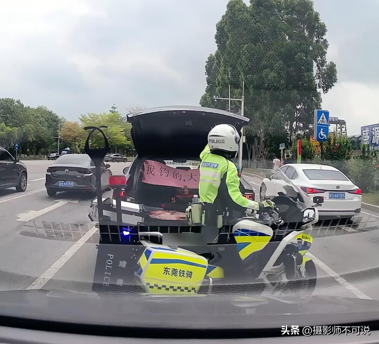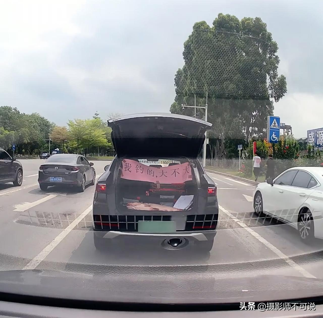 钓鱼佬当街秀战果但帅不过三秒,瞬间被叔叔教做人!钓鱼佬也许是这个世界上最爱秀战果的人了,经常看见有钓鱼佬将钓到的大鱼绑在汽车外夸街,但这种风险太大,容易被叔叔当街挡获教育。于是有些钓鱼佬就开动了小脑筋,比如图片上这位,虽然把战果装在了后备箱,但你拉上横幅是什么意思?而且在等红绿灯时还要把后备箱打开又是几个意思?结果刚刚打开后备箱没两秒就被叔叔亲手给关掉了,然后下场大家都懂。这哥们儿的横幅内容是:我钓的鱼大不大?但我也要问问这哥们儿:遇见叔叔怕不怕?钓鱼佬搞笑日常