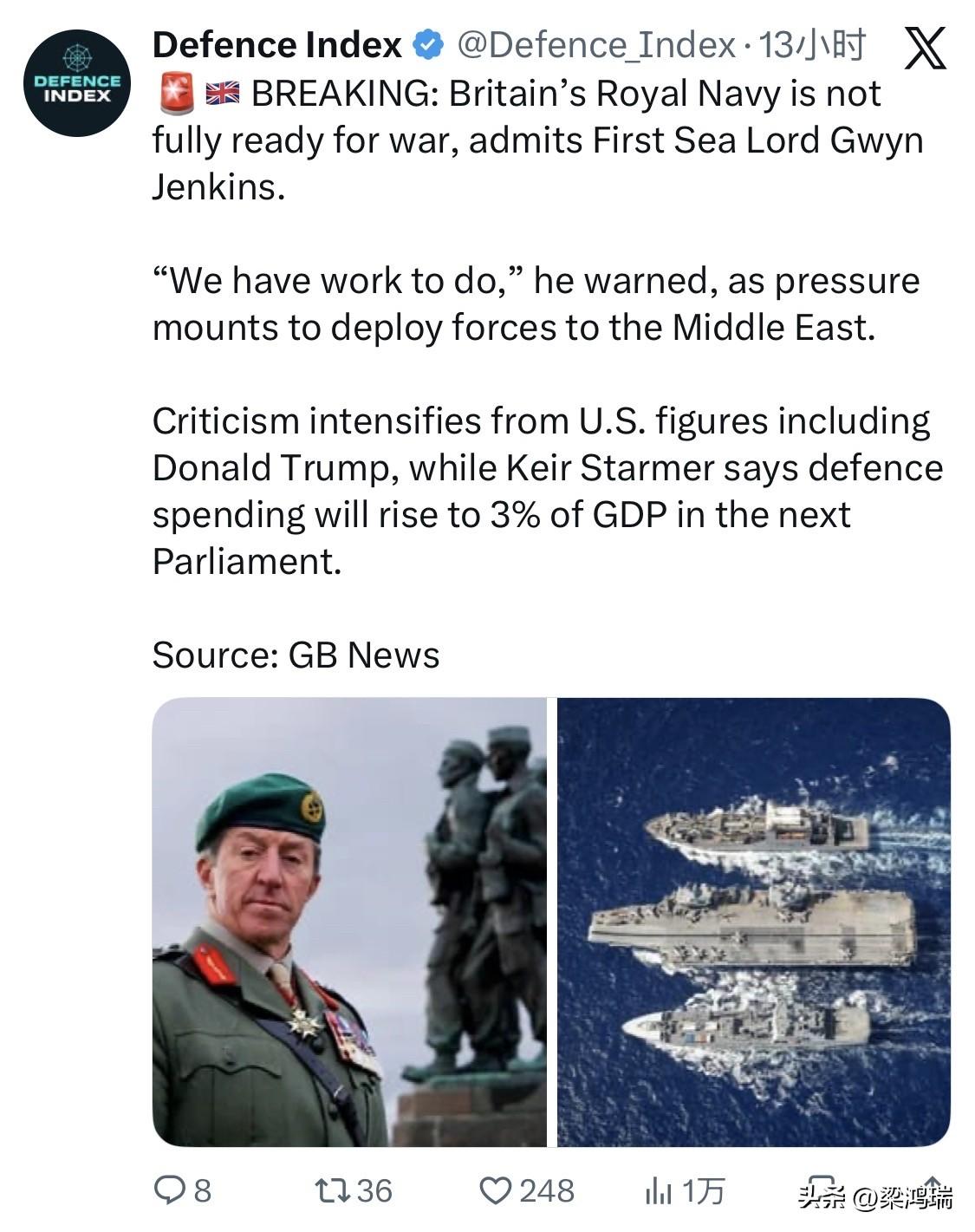 GB News突发新闻:英国皇家海军第一海务大臣格温·詹金斯承认,英国皇家海军尚未完全做好战争准备。 “我们还有很多工作要做,”他警告说,因为向中东部署部队的压力越来越大。 来自包括唐纳德·特朗普在内的美国人士的批评声日益高涨,而基尔·斯塔默则表示,下届议会的国防开支将上升至国内生产总值的3%。