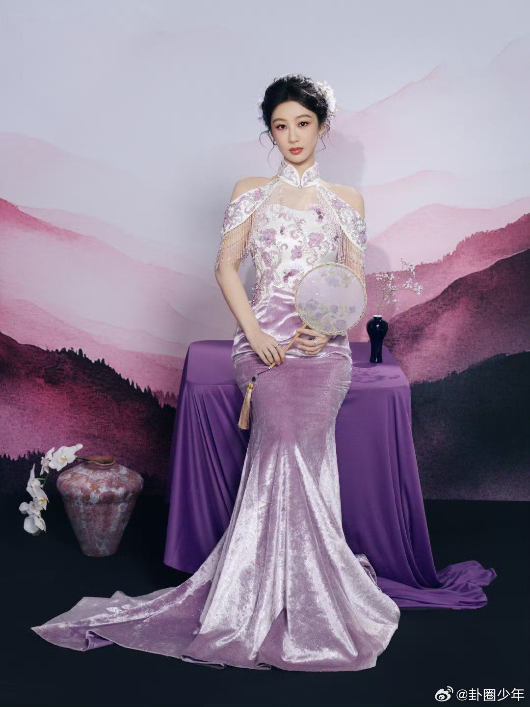 杨紫紫色露肩旗袍杨紫紫色露肩流苏旗袍谁能拒绝穿紫色旗袍的杨紫啊,露肩流苏设计,把