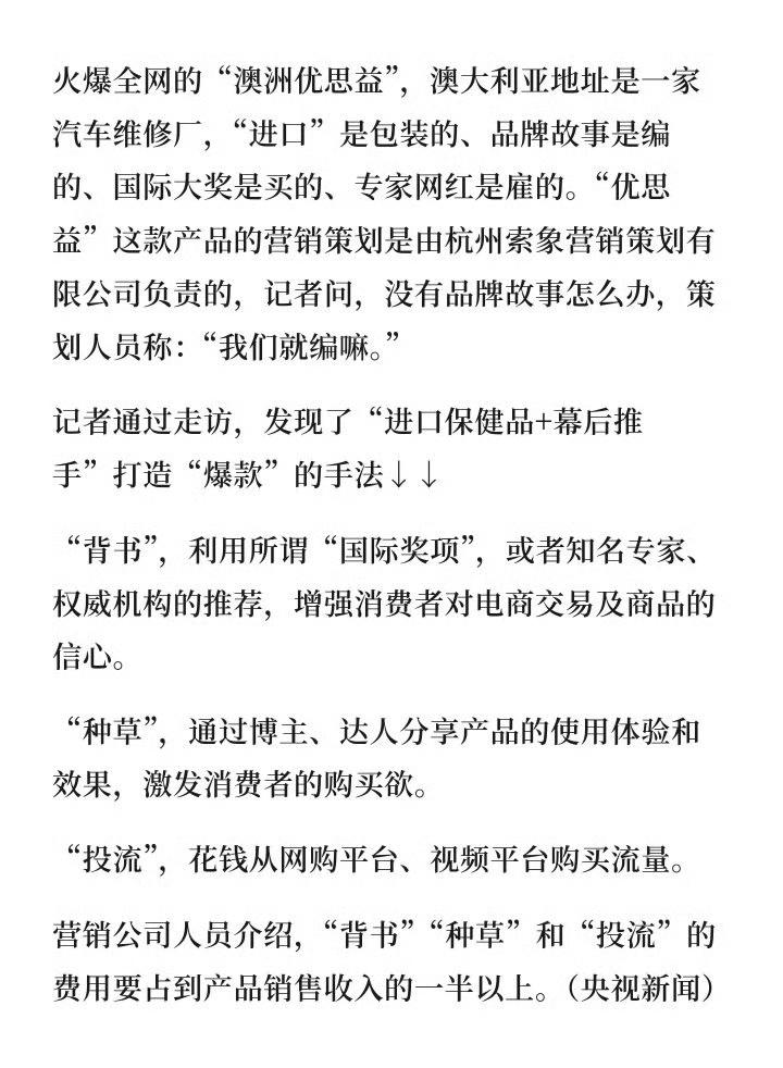 又爆雷!号称澳洲大牌,地址竟是汽修厂,与辉同行卖了上千万 真的太离谱了!最近火遍全网的“澳洲优思益”保健品,直接被央视曝光翻车。 平时吹得天花乱坠:澳洲知名品牌、进口品质、叶黄素、蔓越莓胶囊卖得特别火,好多人冲着“进口、靠谱”闭眼下单。 结果一查真相,笑不活了也气坏了! 包装上写的澳洲地址,实地一看,根本不是保健品厂,就是一家正经汽修厂!产品实际是广州生产,纯纯国产包装成“假洋牌”,专门忽悠咱们老百姓。 更让人意外的是,与辉同行直播间也带过这款货,数据显示:销售额1000万—2500万,卖了7.5万—10万单,好多人都是信主播、信严选才买的。 现在三部门已经介入调查,产品也全面下架,就等着给大家一个交代。 咱们普通人买保健品,真的别迷信“洋牌子”“进口就是好”。国产靠谱的多得是,花冤枉钱事小,吃进肚子不放心事大! 支持严查到底,别让造假的坑到更多人。 你们买过这款优思益吗?平时买保健品踩过哪些坑?评论区说出来,大家一起避坑! 与辉同行卖优思益销售额超千万 优思益地址是汽修厂 假洋牌保健品曝光 保健品避坑