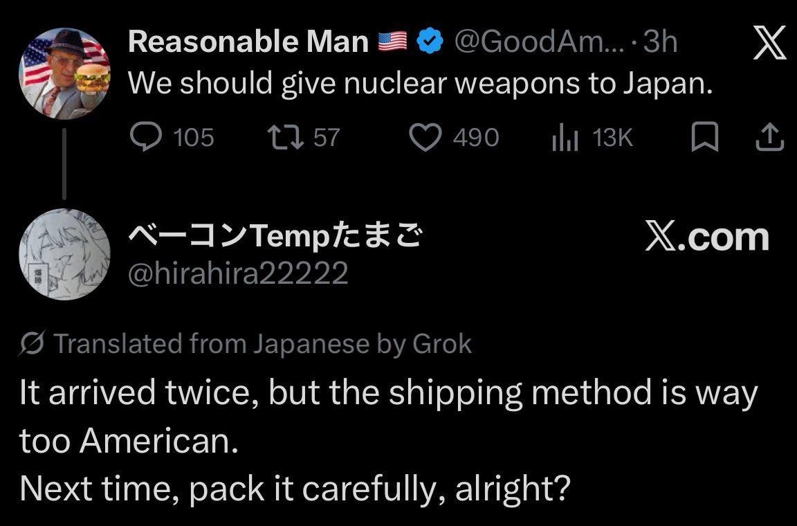 马斯克真的,天天好闲,感觉比我还闲。。。 一个美国人说:我们应该给日本人核武器。(What?又想搞事情?) 然后一个日本人说:你们给过两次了,但是运送的方式太美国化了,下次包装好一点可以吗? 然后被马斯克刷到了。。。。 背景: 二战时期,美国在日本投下的两枚原子弹代号分别为: “小男孩” (Little Boy):于1945年8月6日投放在广岛。这是一种铀弹。 “胖子” (Fat Man):于1945年8月9日投留在长崎。这是一种钚弹。 这两次轰炸直接促使了日本于1945年8月15日宣布无条件投降。