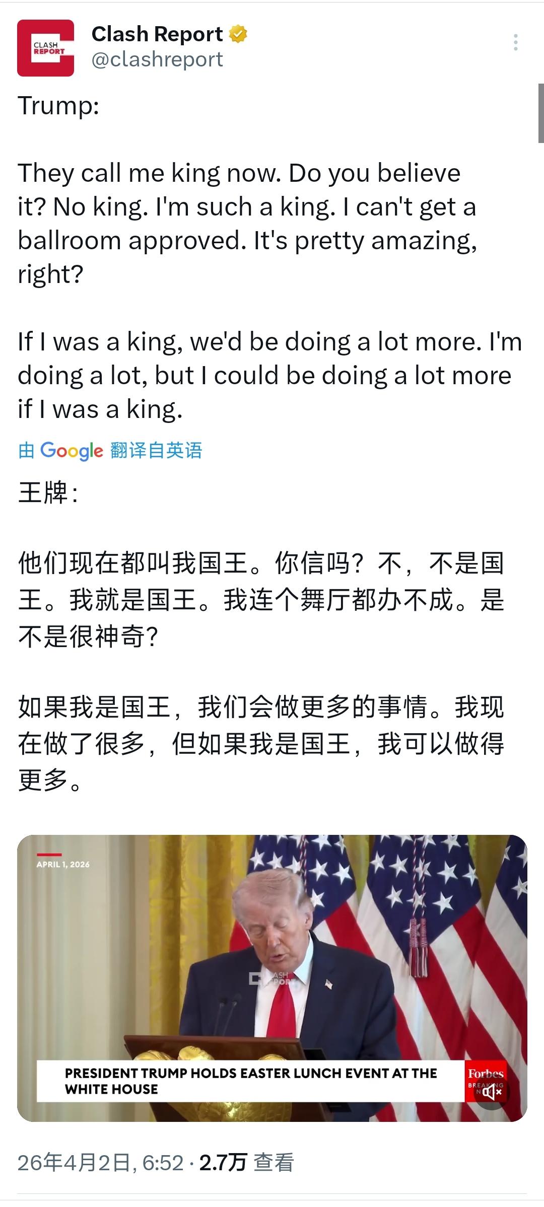 特朗普今天(北京时间4月2日)接受采访时表示:“他们现在叫我国王。你信吗?没有国王。我就是这样的国王。我连个舞厅都批不下来。这挺神奇的,对吧? 要是我是国王,我们就能做更多的事。我正在做很多事,但要是我是国王,我还能做得更多。” [机智]评几句:全美多个城市发起“不要国王”反特朗普抗议游行,但是特朗普不为所动。特朗普在骨子里很希望自己就是国王,此番受访言论更是将其皇权迷梦暴露无遗,一边嘴硬称“没有国王”,一边又自诩“这样的国王”,还因宴会厅项目遭法院叫停怨声载道,俨然一副受了委屈的君主做派。他直言做国王能“做得更多”,彻底撕下美国总统的伪装,将所谓的美式民主遮羞布踩在脚下,全然无视美国250年的宪政根基,也不顾全美900万民众的抗议呼声。这种妄图凌驾于法律和民意之上的狂妄,不仅坐实了民众对其肆意妄为的指责,更让美国所谓的民主典范沦为国际笑柄。这般利令智昏的言论,不过是其权力欲膨胀后的疯言呓语。