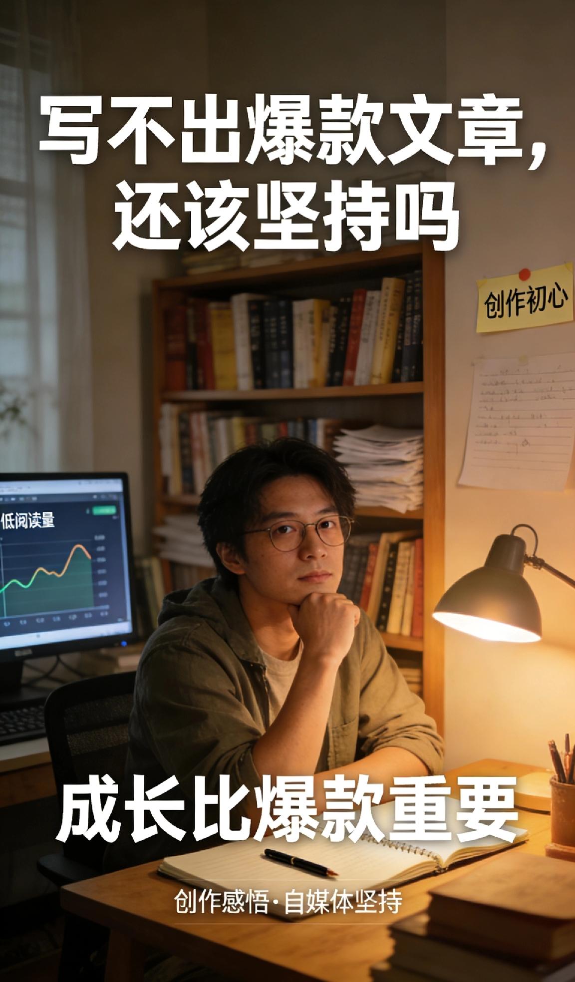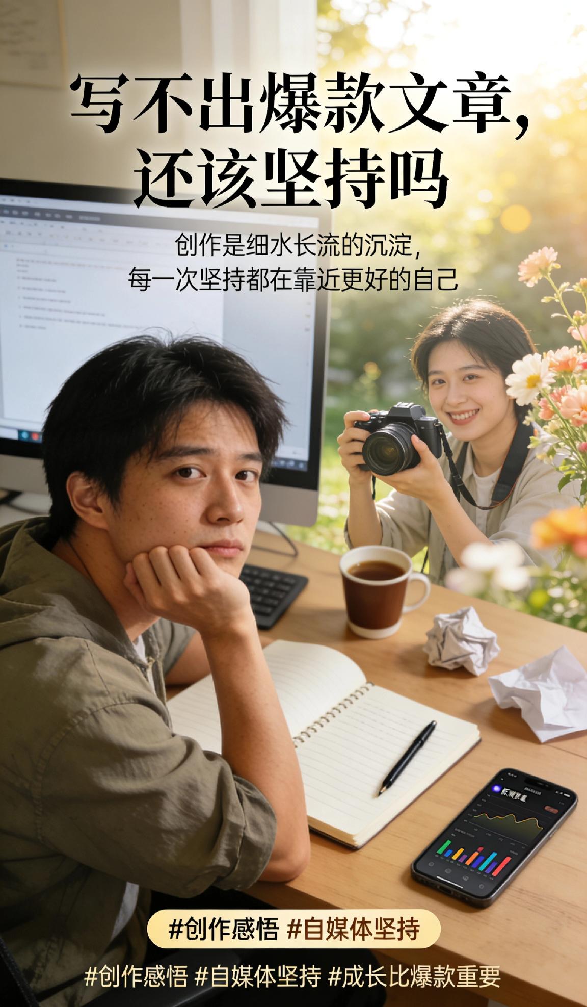 做创作的人,大多都经历过写不出爆款的煎熬:熬了无数个夜晚打磨内容,发出去却寥寥无几的阅读量,看着别人的爆款轻松出圈,难免会自我怀疑,甚至想干脆放弃。 其实爆款从来都不是创作的终点,它需要时机、选题、运气多重加持,可遇不可求。如果只盯着爆款,很容易丢掉创作的初心,陷入内耗。 坚持创作的意义,从来不止是流量。哪怕没有爆款,你也在慢慢打磨文笔,梳理自己的想法,记录生活与思考,这些积累都会变成自己的底气。每一次动笔都是成长,每一次坚持都在靠近更好的自己。 真正的创作,是细水长流的沉淀。别因为暂时没出爆款就否定自己,只要热爱还在,只要还想表达,就再坚持一下,慢慢来,时光终会看见你的努力。 创作感悟 自媒体坚持