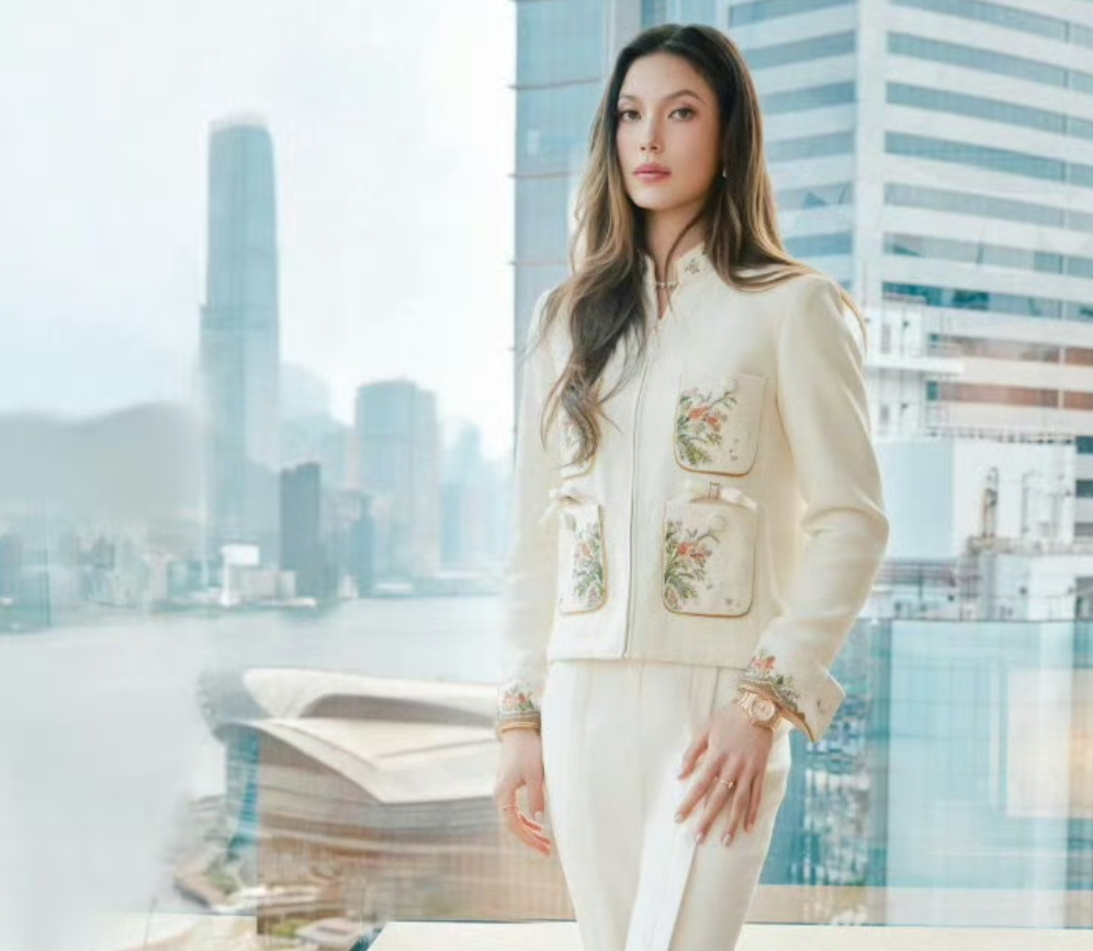 一身白色的中式衣服,胸口四个口袋上绣着传统的花鸟纹样,谷爱凌在讲台上自信地演讲着女性的力量,配合着相应的动作,尽显女性之美