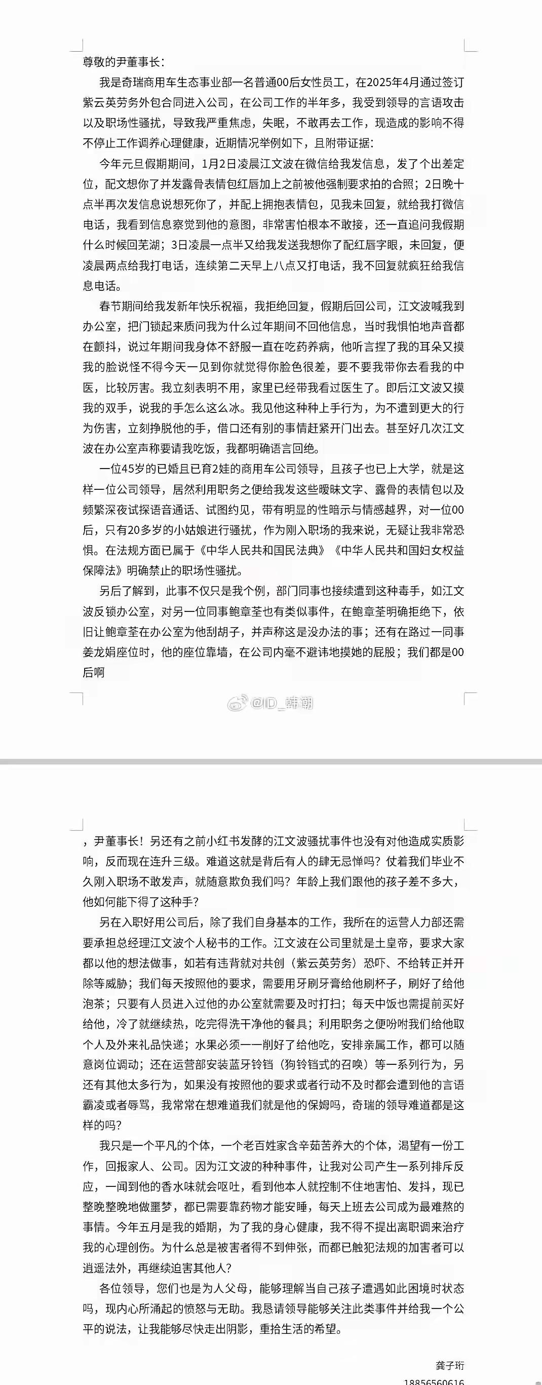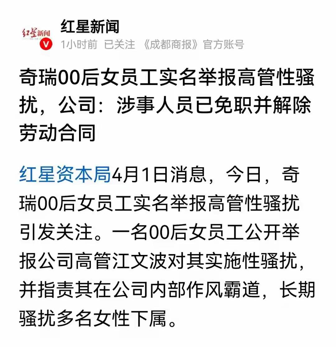 奇瑞“土皇帝”高管深夜狂发“想你了”骚扰00后女下属!4月1日聊天记录曝光,免职背后还有多少职场黑暗角落待曝光? 4月1日当一封实名举报信在网络上炸开,我们看到的不仅是45岁高管对20岁女下属的露骨骚扰,更是职场权力碾压下无数年轻人的无声挣扎。凌晨两点的“我想你了”,锁死的办公室门,被迫刮胡子的屈辱——这哪里是现代企业,分明是封建余孽的土皇帝戏码! 聊天记录里那句“想死你了”像一把刀,刺穿的不仅是女孩的尊严,更是所有职场新人的安全感。一个已婚已育、女儿已上大学的男人,对着年龄足以当自己孩子的下属发送红唇表情,这不是情感流露,而是权力肆无忌惮的狩猎。更可怕的是,这早已不是初犯。 为何上一次举报后他竟能连升三级?为何要等到舆论沸腾才启动调查?当公司内部铃铛变成召唤下属的“狗铃铛”,当泡茶刷杯成为工作考核,我们不得不问:究竟还有多少“江文波”藏在光鲜的职位背后,把团队当成私人后宫? 女孩颤抖着声音说“闻到他的香水味就会呕吐”,这句话背后是多少个失眠的夜晚。她原本只想好好工作回报家人,却在最该绽放的年纪被迫吞下恐惧。而她的遭遇绝非个例——摸屁股、锁门刮胡子、言语霸凌…这些细节拼凑出的,是一幅权力失控的骇人图景。 奇瑞的免职决定来得及时,但远远不够。当骚扰已成惯常操作,当举报反成晋升阶梯,企业文化早已亮起红灯。我们需要追问:是谁在为他保驾护航?那些沉默的旁观者,是否也成了帮凶? 职场不是丛林,下属更不是猎物。00后们用实名举报撕开黑暗,她们要的不仅是一个人的倒台,更是一个让年轻人能挺直腰板工作的环境。每个企业都该明白:保护不好员工尊严的地方,终将失去所有人的信任。 这封举报信最震撼的,是落款处那串手机号码。她赌上一切,只为不让更多人跌入同样的深渊。当我们为她的勇气鼓掌时,更该用行动筑起防火墙——让每个“江文波”知道,这个时代,权力不再是免罪金牌。 (来源:根据奇瑞公司通报、当事人举报信及网络公开信息整理) 职场黑暗 拒绝骚扰