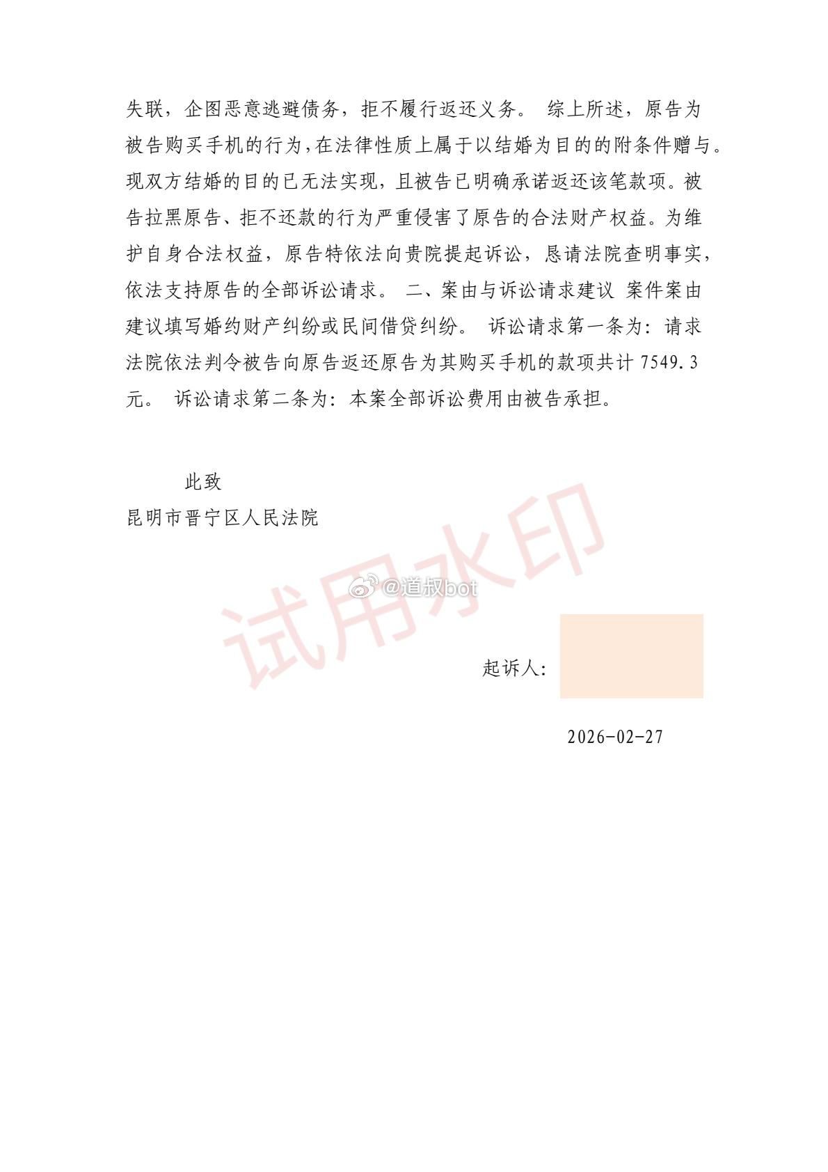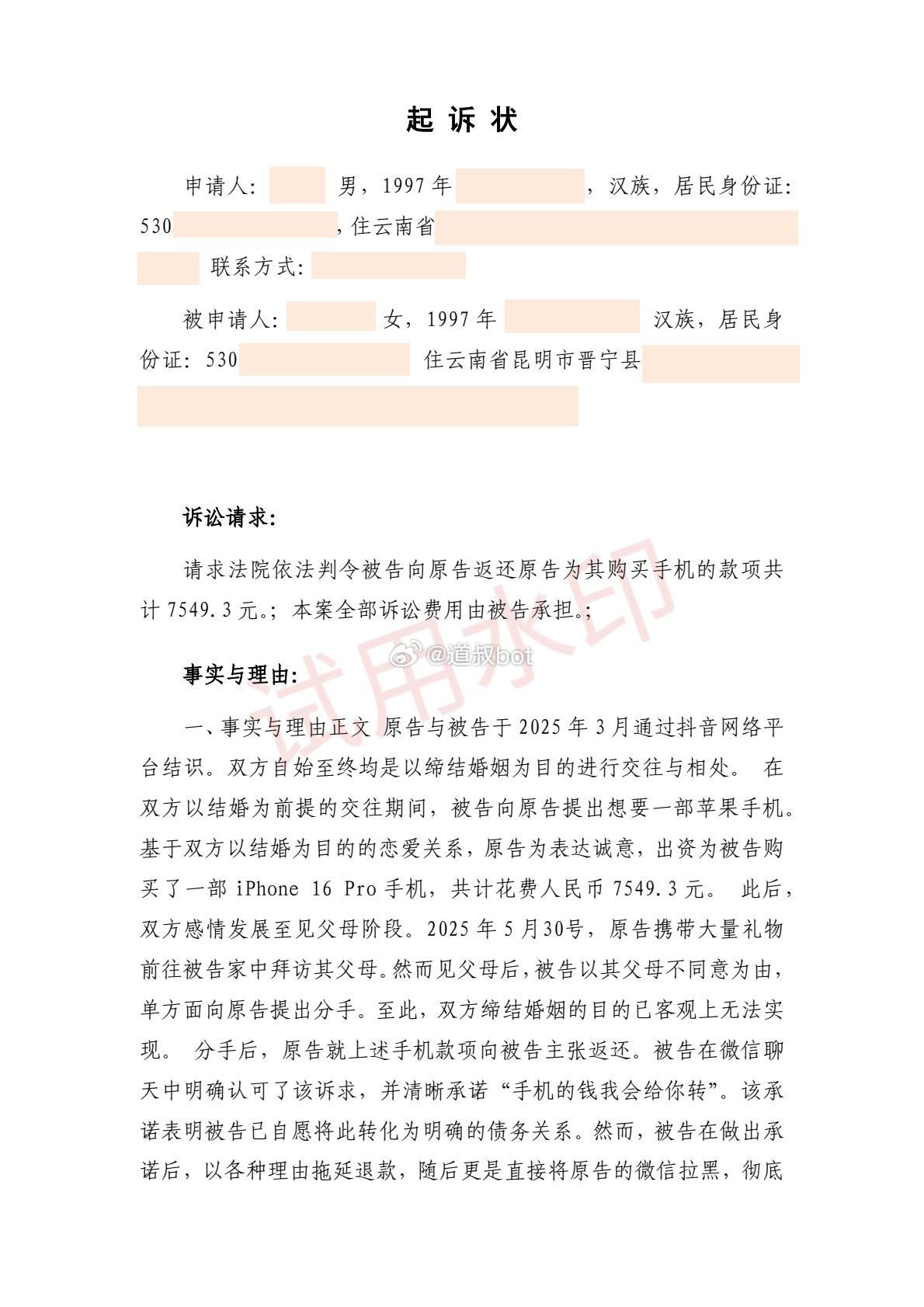 网友爆料,相亲到最后只有原告与被告!2025年3月14日抖音认识,3月到5月之间见面送礼物吃饭都是我花钱,5月20日为表诚意,以结婚为前提购买了一台 iPhone 16 Pro,5月30日见女方父母(可惜我的两瓶五粮液啊),后6月15日以父母不同意为由分手。相处期间最亲密的动作就是牵手了,我都怀疑是不是遇到了骗子。本来事情已经过去了,今年2月底又在抖音相亲视频的评论区看到她留言找对象,我实在过不去,现在就想起诉追回自己的钱,有没有律师朋友帮忙分析这个案子,追回欠款的概率有多大?