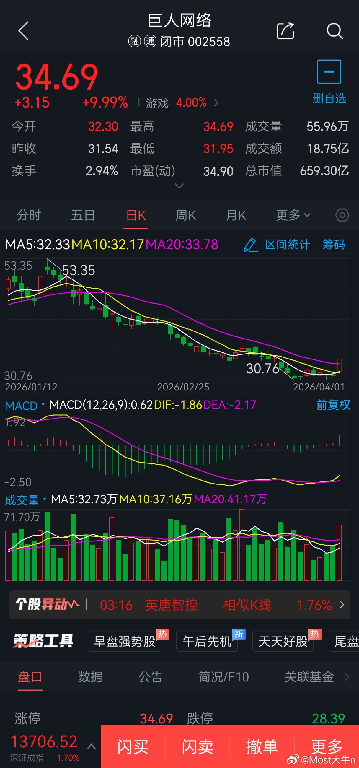 概念题材:网络游戏,可于34元附近2成仓位参与,盘中下探到33.30元附近增加2成仓位。