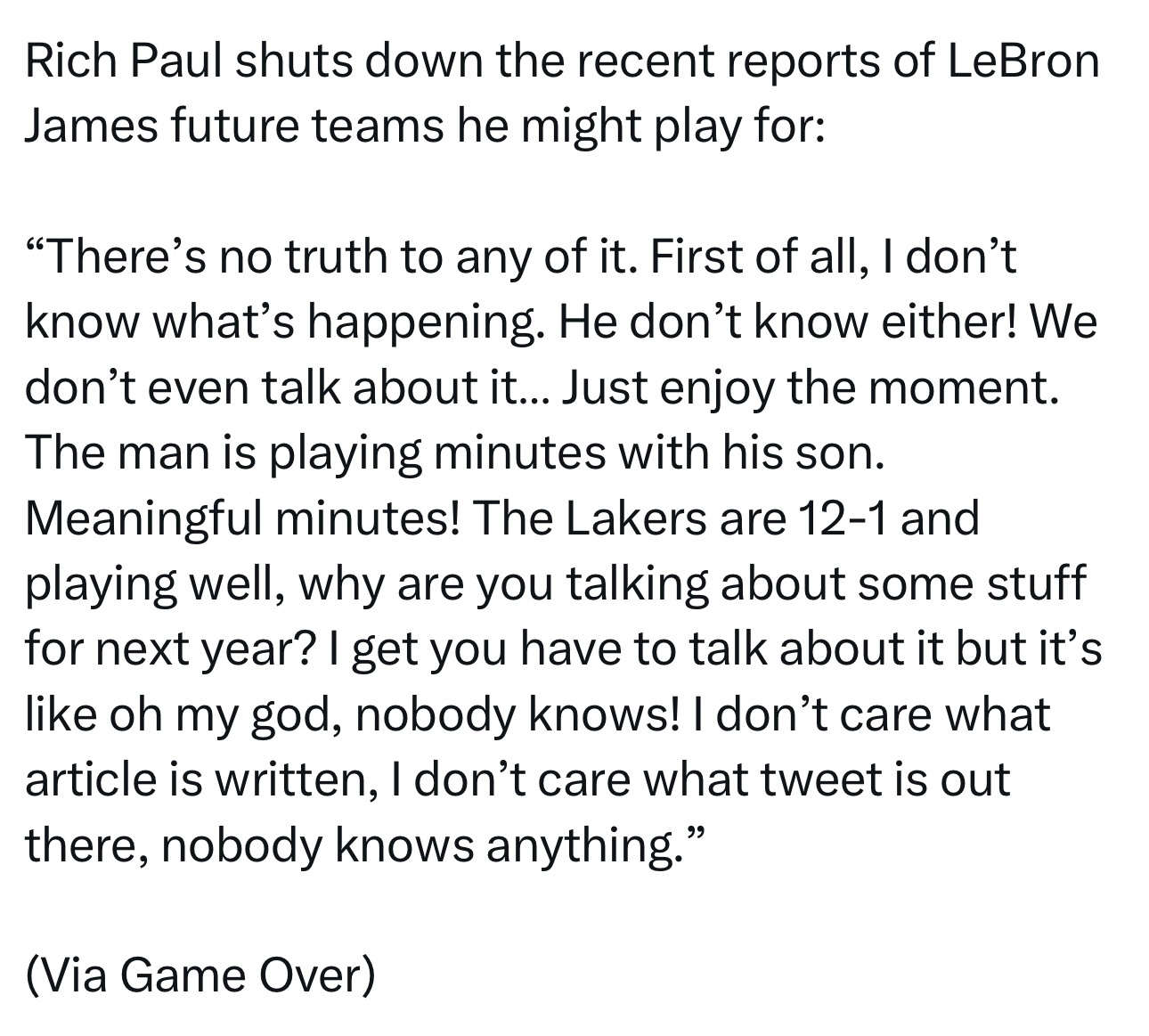 “这些报道毫无真实性可言。首先,我并不清楚未来会发生什么,他本人也同样不清楚!我们甚至从未讨论过这个话,只需享受当下就好。这位传奇球员正与自己的儿子同场竞技,这是极具意义的时刻!湖人目前取得了12胜1负的战绩,状态正佳,为何要去讨论明年的事?我理解媒体需要相关话题,但说实话,天呐,没人知道未来的走向!无论发表了什么文章、发布了什么推文,没人知道任何事。”