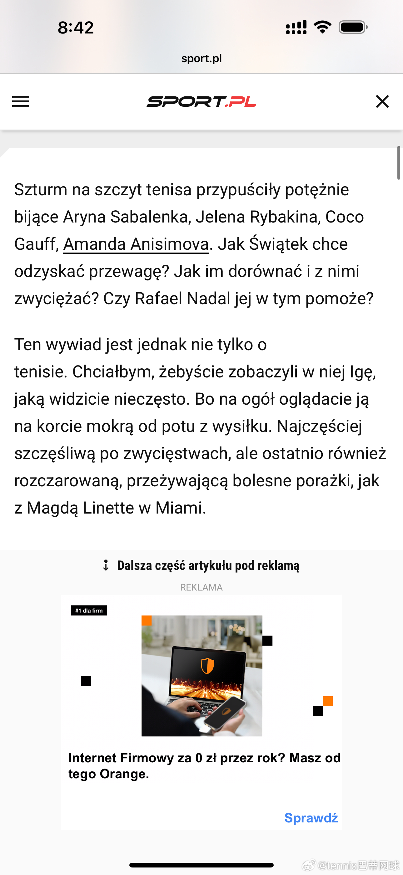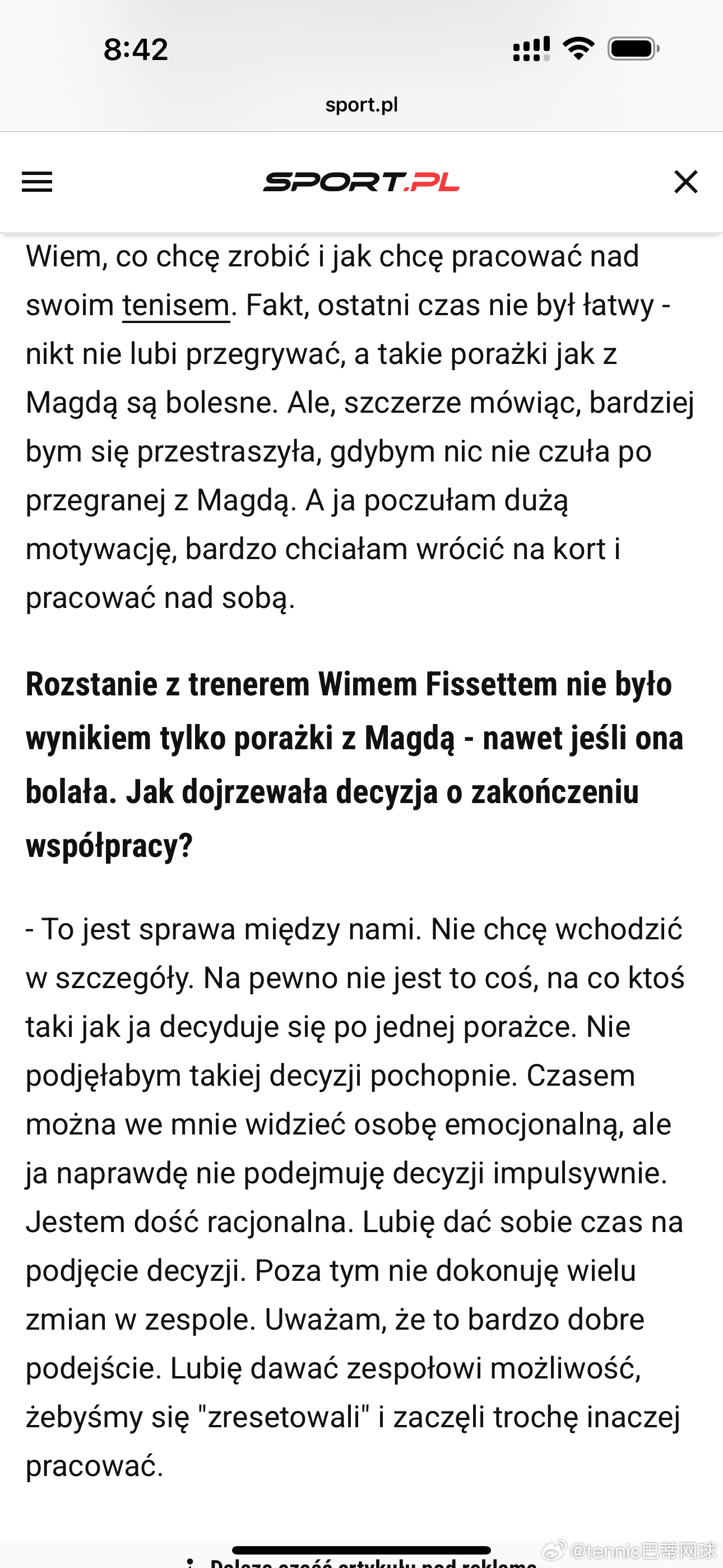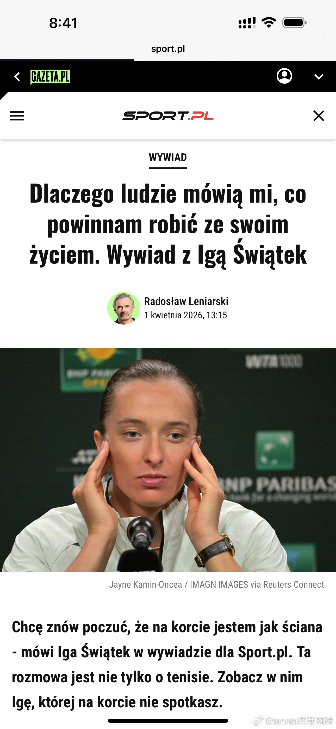 斯瓦泰克:“和谁合作,是我自己决定的。说实话,我看到的那些负面言论……我尽量不去看,但有些还是会传到我耳朵里……基本都是假新闻,和为了博眼球编造出来的说法。人们根本不知道真实情况是怎样的。