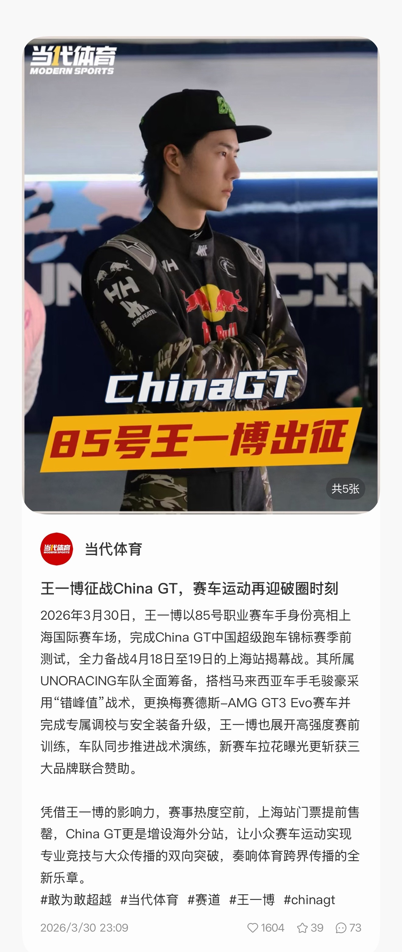 当代体育:凭借王一博的影响力,赛事热度空前,上海站门票提前售罄,China GT更是增设海外分站,让小众赛车运动实现专业竞技与大众传播的双向突破,奏响体育跨界传播的全新乐章。这才是明星破圈的正确打开方式!王一博:让专业被看见,让热爱被传播~