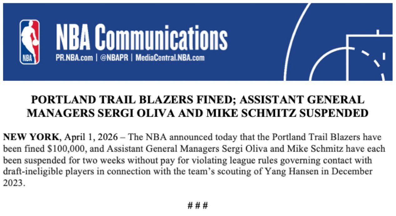 同时开拓者副总经理迈克-施密茨与塞尔吉-奥利瓦也被处以停职两周的处罚。