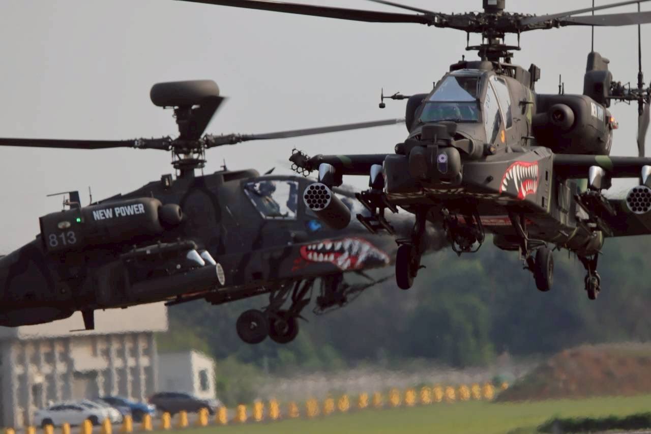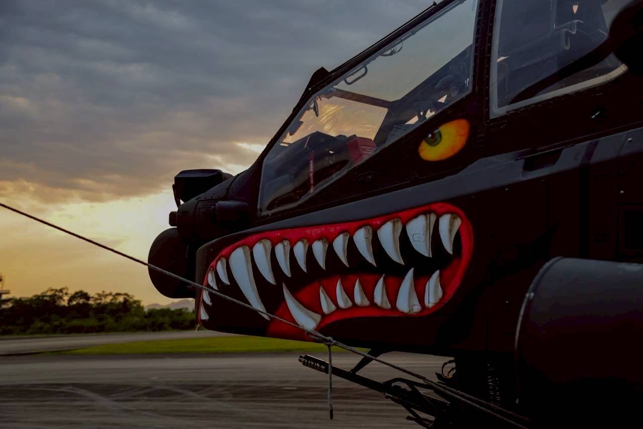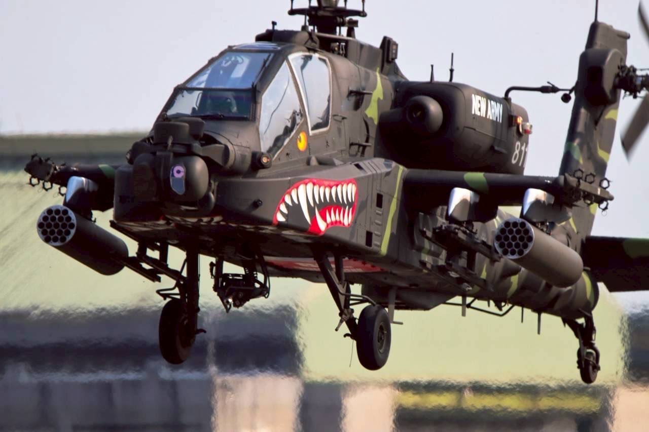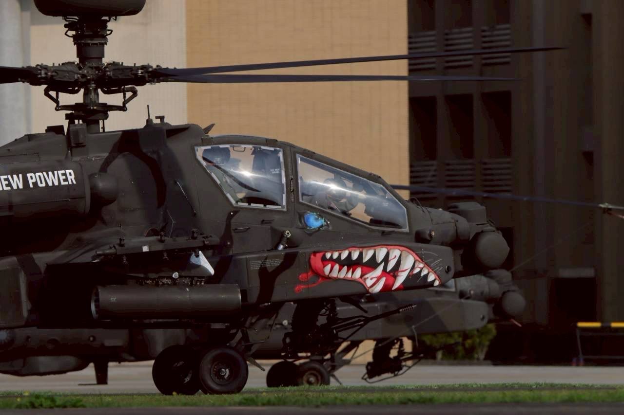 飞扬军事 台匪軍阿帕契武装直升机最新鲨鱼嘴涂装,纪念陆軍司令部成立80周年。