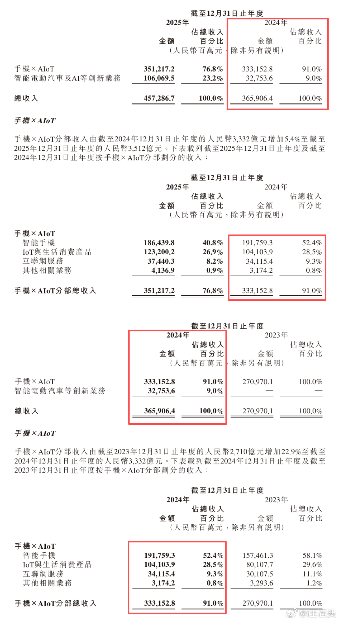 图二是小米最新财报和去年的财报对比,2024年的数据完全一致。