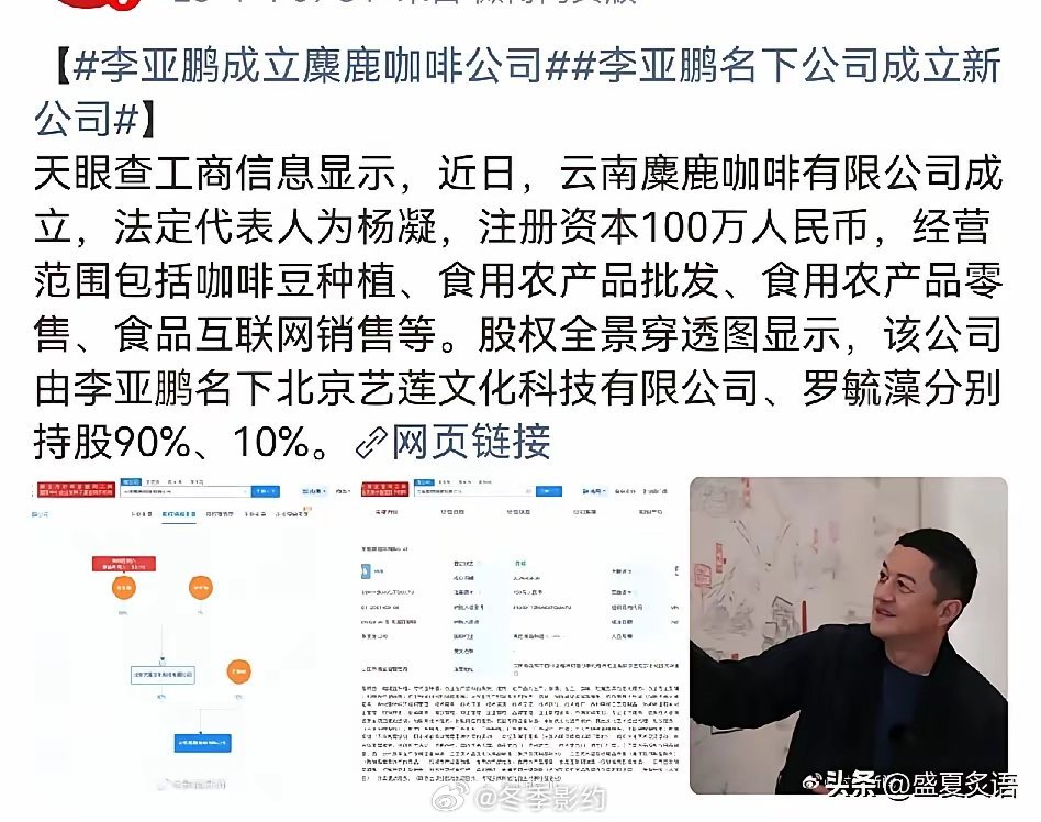 李亚鹏,让人担忧!3月31日深夜,李亚鹏连夜冲上了热搜,这次和“嫣然天使”无关,而是他做出让人担忧的举动,居然又要开始创业了,这到底是怎么回事呢?原来,李亚鹏又开新公司了——云南麋鹿咖啡有限公司,注册资本100万,经营范围从咖啡豆种植到线上销售全覆盖,妥妥的全链条布局,不过这次网友却没有特别赞成。毕竟这些年,他的创业履历几乎是“屡战屡败”的代名词:早年房地产项目折戟,文旅项目陷入债务纠纷,多次被列为被执行人,甚至传出过无力偿还的传闻。如今从文化圈跨界咖啡赛道,看似背靠云南产地优势,实则暗藏不少隐忧。从股权结构看,公司由他旗下的北京艺莲文化控股90%,但100万的注册资本,在咖啡行业里只能算起步。且咖啡市场早已是红海,从连锁品牌到本土精品店竞争白热化,新品牌想突围,资金、供应链、品牌运营缺一不可,而这些恰恰是他过往创业的短板。