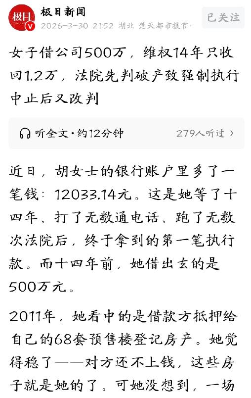 太讽刺了!黑龙江大庆,女子一时冲动,将全家的500万血汗钱借给某房地产公司,对方承诺四个月就还,给20万利息,要是还不上,就用68套房子做抵押,谁知,借款到期后,对方丝毫没有还钱的意思,以各种理由一拖再拖。 这年头,借钱出去容易,要回来难,这话放在黑龙江大庆的胡女士身上,简直轻了,她怎么也没想到,全家攒了大半辈子的500万血汗钱,借出去的时候想得挺美,最后却换来了一场长达14年的噩梦。 这事还得从2011年夏天说起,那时候胡女士三十七岁,经人介绍认识了一家房地产公司的老板,对方说得天花乱坠,说公司周转不开,想借500万,就借四个月,到期不光还本,还额外给20万利息。 怕胡女士不放心,老板拍着胸脯说,要是还不上钱,就用正在开发的“远望松江小区”68套房子抵债,随便挑。 500万不是小数目,胡女士自己拿不出来,找父母和亲戚东拼西凑才凑齐,但她心想,这么大一个房地产公司,总不能跑了吧。 况且四个月就能赚20万利息,就算真还不上,68套房子在那摆着,怎么算都不亏,双方白纸黑字签了借款合同,还办了预售楼登记,胡女士觉得这事稳了。 结果四个月一到,公司那边开始变脸了,今天说资金还没回笼,明天说手续在走流程,反正就是一个字:拖,胡女士催了又催,对方压根没有还钱的意思。 2012年她一纸诉状把房地产公司告上法庭,大庆市中级人民法院判她胜诉,查封了那68套房子,让公司还钱,不还就拿房子抵债。 拿到判决书那天,胡女士以为钱总算要回来了,可等她去申请强制执行的时候,出了岔子,2013年底这家公司正事宣布破产。 这一破产,胡女士手里的判决书就跟废纸一样了,所有针对公司的执行都得停下来,她被强行塞进了破产清算的队伍里。 胡女士后来才知道,这家公司的营业执照早在2011年4月,也就是借钱给她之前三个月,就已经被吊销了。 之后的日子,胡女士就开始了漫长的维权路,时间一年一年过去,她的头发白了,皱纹深了,那500万却像石沉大海,一点回音都没有。 转机出现在2022年,相关部门恢复了执行,胡女士又燃起了希望,她赶紧跑去申请查封当年那68套房子,结果被告知,这些房子早在2014年到2016年间就被破产管理人卖得差不多了,68套只剩下7套还在。 她想那也行,7套就7套吧,可法院刚要处置这7套房子,又有人跳出来说其中4套在查封前就买过了,处置程序又被叫停。 折腾到2025年5月,大庆市中级人民法院裁定终结这次执行程序,法院从公司账户里扣划了12115.14元,扣掉82元执行费,胡女士拿到了12033.14元。 14年,500万,最后到手一万二,别说本金,连当年承诺的20万利息的零头都没够上。 现在胡女士52岁了,手里还攥着当年那摞厚厚的法律文书,她说自己把所有的希望都寄托在法律上,明明有理,为啥500万最后只拿回这么点。 那68套房子卖了,钱去哪了,谁也不知道,当年处置资产的破产管理人,电话打过去没人接。 这大概就是最讽刺的地方——当初她以为68套房子是护身符,没想到最后成了镜花水月;她以为赢了官司就能拿回钱,没想到赢了官司才是磨难的开始。