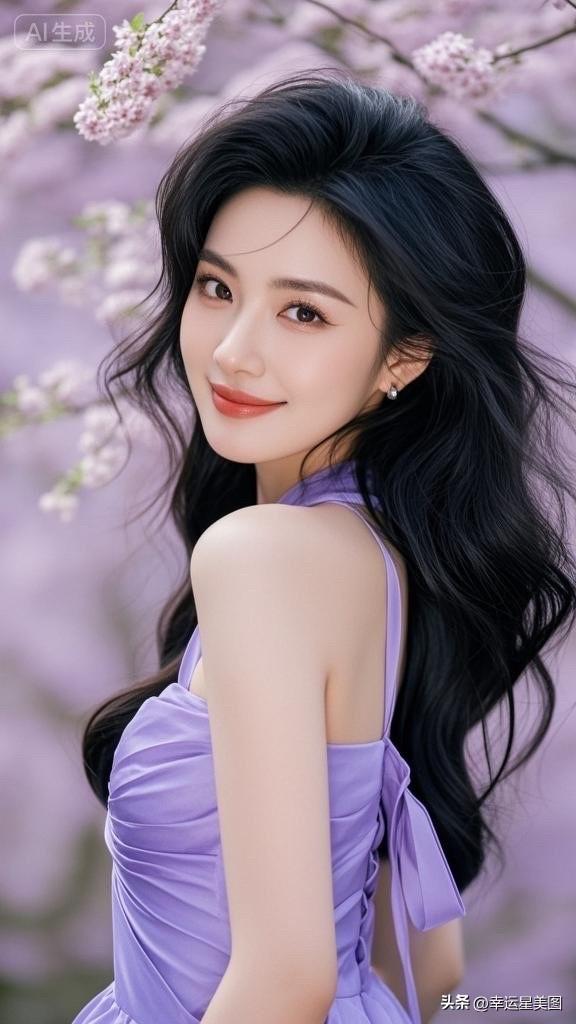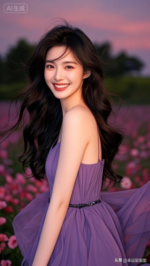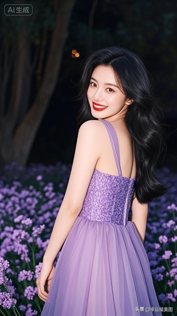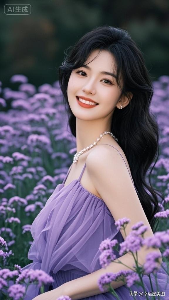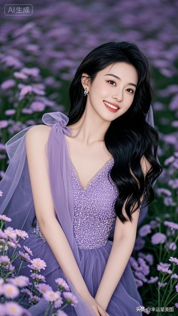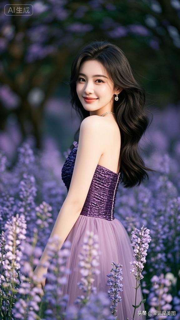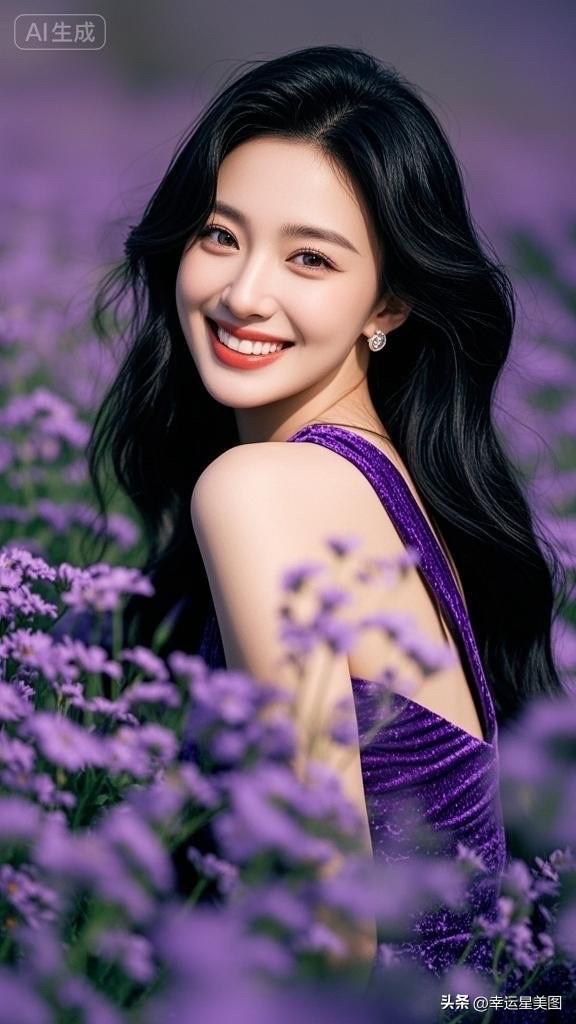 梦幻紫色花海中的优雅仙女,微笑如花绽放