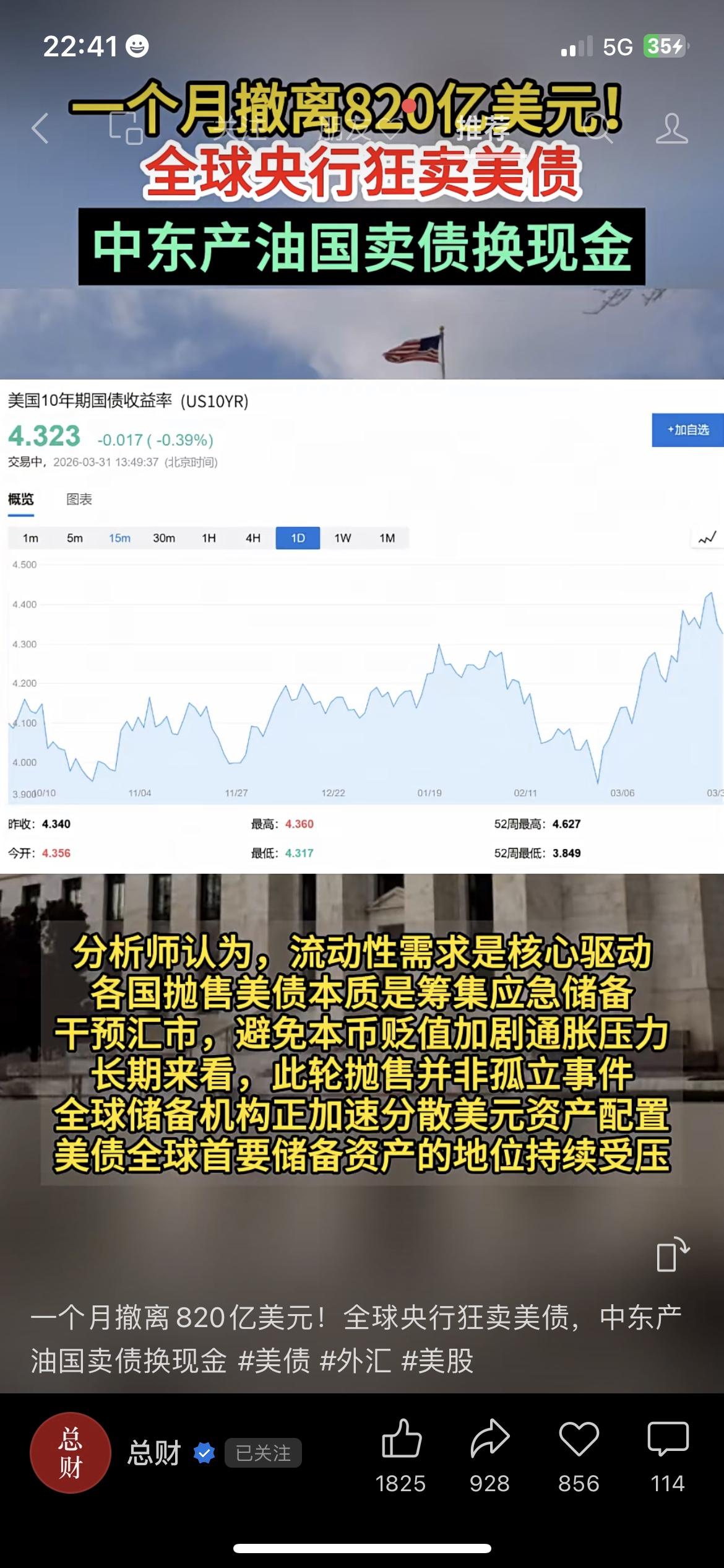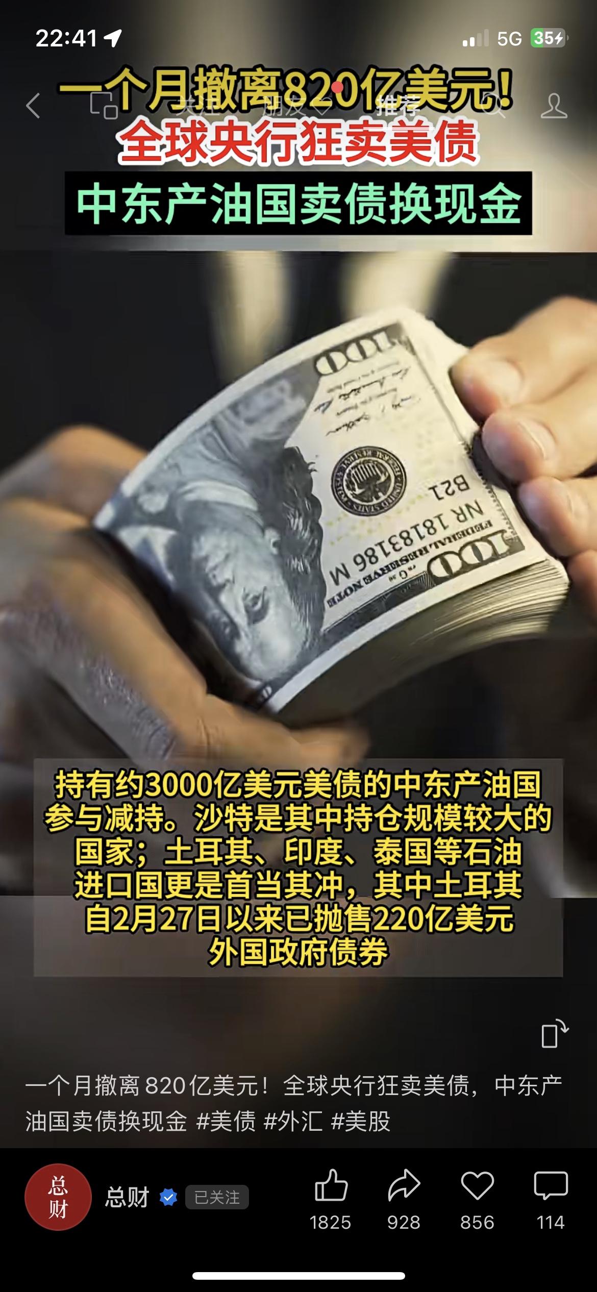820亿美元!全球央行狂抛美债,规模创2012年新低! 美联储数据显示,全球央行单月狂抛820亿美元美债,托管规模降至2.7万亿美元,创2012年以来最低。中东产油国带头减持,导致美债承压、收益率上涨。 此次集中抛售,反映全球资产配置格局变化,美元资产吸引力减弱,黄金等避险资产关注度提升。 市场有风险,投资需谨慎,本文不构成任何投资建议。 全球央行 美债抛售 美元走势 财商资讯