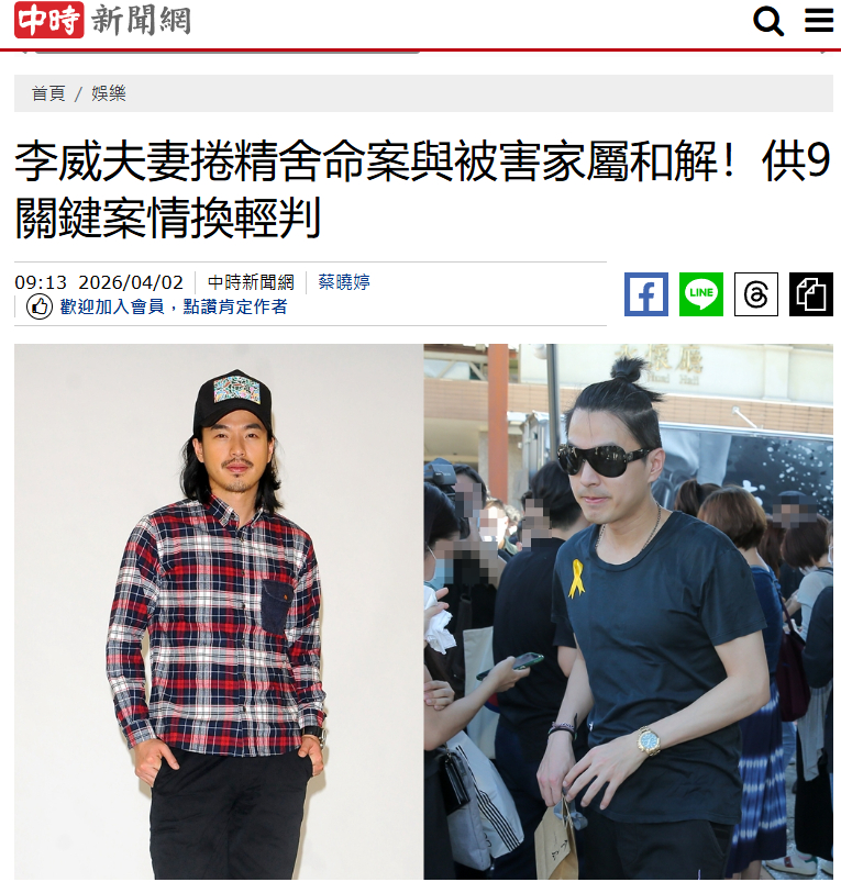 【台媒曝精舍命案受害者家属与李威和解】李威与精舍命案受害者家属和解据中时新闻网,艺人李威卷入台北市精舍命案引发广泛关注。去年侦查终结,依伤害致死、强制、伪造文书、诈欺等罪起诉王蕰、李威等人。1日台媒消息,受害者家属已经和李威夫妻达成和解,同意法院轻判。受害者家属表示,李威夫妇在去年11月就不断通过律师表达和解意见,并与受害者家属在律师事务所见面,还原所知的案情经过,让家属能掌握蔡姓女子过世的原因,考量到李威夫妻已经做出合理赔偿,请法院从轻量刑。李威曾饰演《放羊的星星》韩志胤、《海派甜心》何言风、《斗牛,要不要》金子聪。