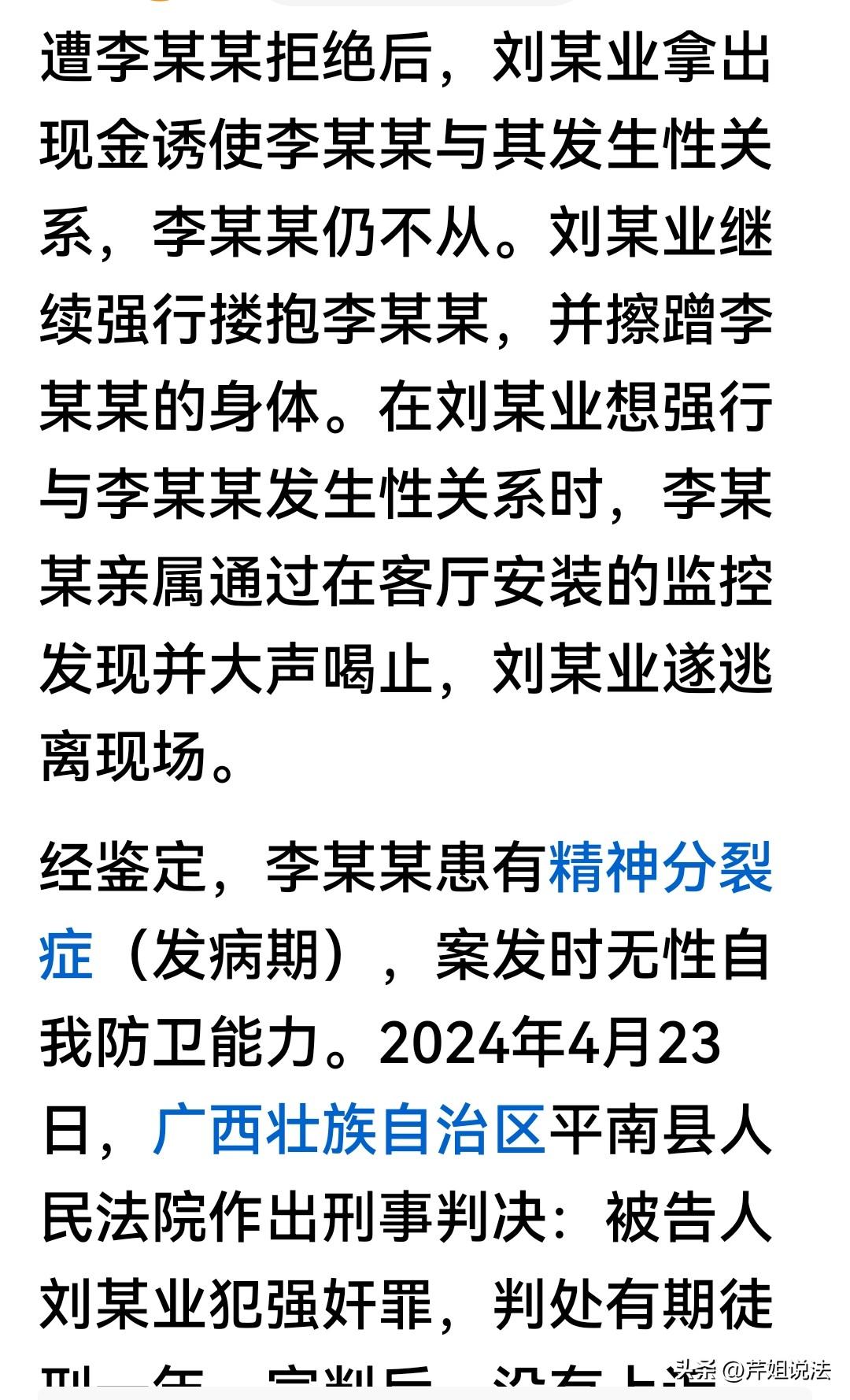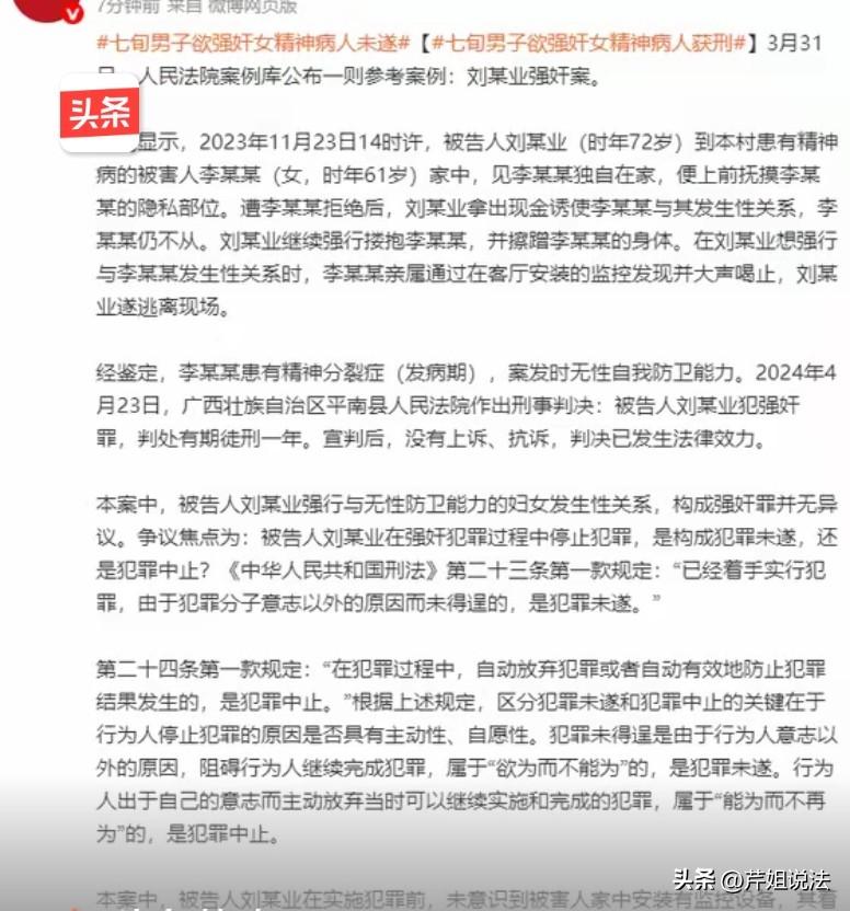广西,72岁的老汉,到61岁的大妈家中,想和对方在一起,结果大妈非常抗拒,大妈患有精神分裂症,当日也正是发病期间,老汉见状就想用现金打动对方,但大妈还是拒绝了在一起,最后老汉有点恼怒,想强行在一起,结果被大妈的家属从监控中发现,立即呵斥对方,让他赶紧离开,老汉怕事情败露,不敢再在大妈的家里待着,于是立即跑了,不过最后老汉被判处有期徒刑一年,这引起了大家的讨论。 61岁的李某某,正在客厅看着电视,突然外面就来了一个人,看上去年纪也不小了,是一个老汉。 李某某不认识这个人,因为李某某患病了,认不清楚这些人。 可是这个老汉却在喊李某某的名字,还问李某某在干嘛?家里有没有人? 李某某不想搭理这个人,因为家人告诉过李某某,如果一个人在家,就把门锁好,不要让人进来。 可是这个人已经来到了他们家里,李某某也没有办法把他赶走,只是本能地在躲着对方。 而这个老汉四处看了看,发现家里没有人,就想过来和李某某一起。 李某某非常抗拒,但老汉还是去挨着李某某,想要去摸一摸。 李某某直接站起来走开了,但老汉还不死心,从破烂的裤兜里拿出几层钱来,想让李某某拿去买零食吃。 李某某想起,家人给她讲过,不能接受别人的钱,准没好事。 于是也拒绝了,摇摇头,说不能要。 老汉无计可施,又看了看外面,再看了看屋内确定没有人后,就想直接去抱李某某。 李某某吓得到处躲,老汉好不容易搂住了李某某。 他正想实施下一步的时候,突然听到监控里传来呵斥声,让他赶紧离开,不然马上报警。 老汉回头一看,发现上方有一个监控,知道是李某某的家人发现了自己。 如果自己不赶紧跑,除了挨打不说,最后说不定还要被抓走。 于是老汉放了李某某,扭头就跑了。 最后,家属还是报了警,老汉也被抓走了,最终被判处一年有期徒刑。 不过这件事大家有点不明白,这不是还没有实施吗?怎么就被判刑了呢? 并且判决后,老汉也没有上诉,自愿认罪认罚。 当然,这个老汉是他们本村的人,名叫刘某业,他就是知道李某某患病了,如果没有人在家,他就可以轻易的欺负人家。 但很多人不理解:事情没成,为什么还要判刑? 根据《刑法》第二十三条:已经着手实行犯罪,由于犯罪分子意志以外的原因而未得逞的,是犯罪未遂。对于未遂犯,可以比照既遂犯从轻或者减轻处罚。 《刑法》第二百三十六条:以暴力、胁迫或者其他手段强奸妇女的,处三年以上十年以下有期徒刑。 其实很简单:他不是自己主动放弃,而是被家人监控喝止、被迫停下,属于法律上的犯罪未遂。 只要已经动手实施侵害行为,就算没完成,同样构成犯罪。 考虑到他属于未遂、到案后认罪态度好,法院依法从轻作出判决,判处一年有期徒刑,既符合法律规定,也合情理。 对于此事,大家如何看? 素材来源于九派新闻