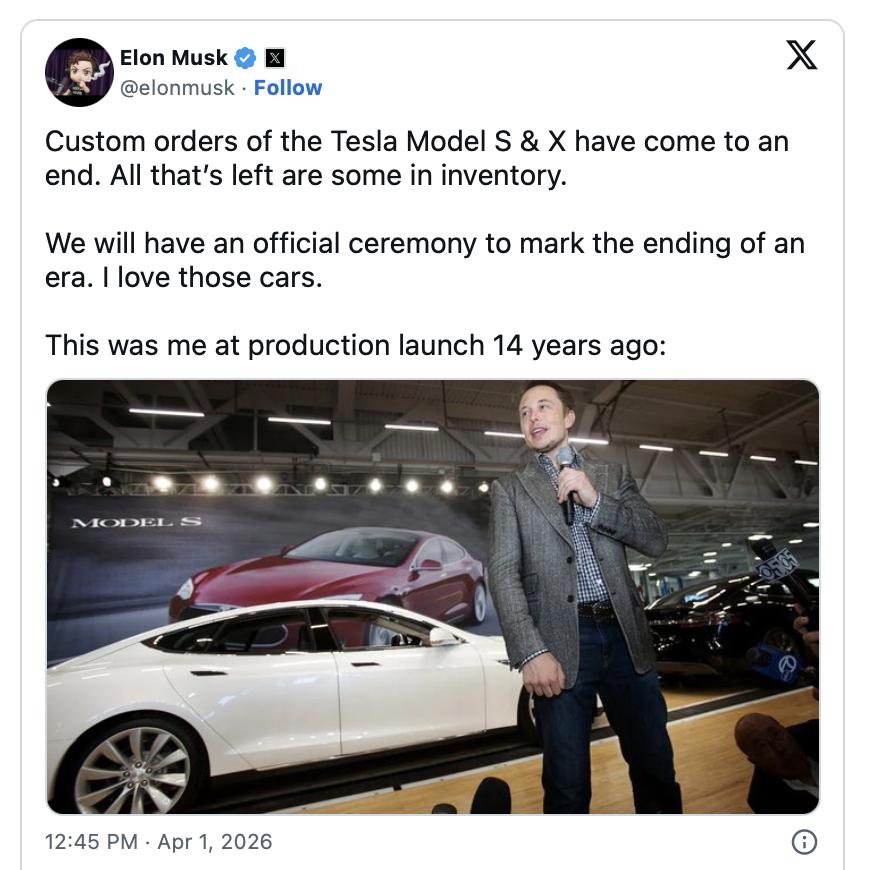 马斯克要给Model S和Model X退市将举办仪式 特斯拉已正式开始逐步停止Model S和Model X的生产,3月27日向美国客户发送了告别邮件,并更新了官网,消费者现在只能看到数量有限的Model S和Model X库存车辆可供购买,无法配置全新工厂生产的车辆。 马斯克在推特上发布了一张他2012年在Model S量产发布会上发表讲话的旧照,并写道:“我们将举行一个正式的仪式来纪念一个时代的结束。我爱这些车。” 特斯拉此前从未为任何一款车型举办过正式的告别活动,而马斯克的帖子预示着这将会是一个精心策划的仪式,而非悄无声息的停产。 Model S于近十五年前首次上市,是特斯拉首款完全自主设计的车型,证明了电动汽车可以兼具速度、吸引力和长续航里程。 2015年,Model X问世,凭借其标志性的鸥翼门设计吸引了众多目光,并成为市场上首批纯电动SUV之一。特斯拉的这两款旗舰车型最终促使传统汽车制造商认真对待纯电动交通,并为更经济实惠的Model 3和Model Y的研发提供了资金支持。 不过到2025年,这两款车型在特斯拉的销量中几乎可以忽略不计。马斯克直言不讳地表示:“我们将把那片生产空间改造成Optimus工厂。这是我们向自动驾驶未来转型的一部分。”【来自懂车帝车友圈】