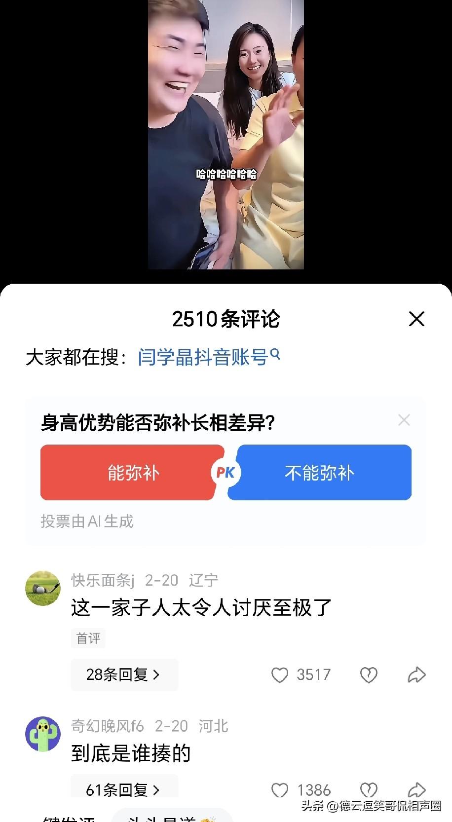 这一家子可太招人烦、太不要脸了。闫学晶和儿子、儿媳妇一起直播,闫学晶对儿子说:“他们都说你有点儿像郭德纲。”儿子回应:“妈,我说句不中听的,你可别埋怨我。”闫学晶说:“你说吧。”儿子接着道:“我身高1米9,郭德纲把9调过来都不够呢。”这一番话可把评论区的网友给气坏了了,真是不是一家人,不进一家门啊。