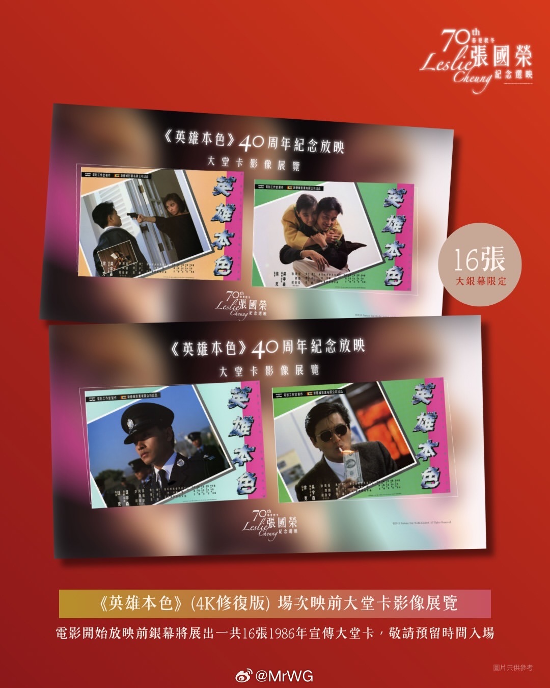 张国荣影讯 香港MCL戏院“第70个春夏秋冬──张国荣纪念选映”🎦,发布【英雄本色】40周年纪念、4K修复版重映新角色海报,张国荣 “宋子杰”、狄龙“豪哥”、周润发“小马哥”回到大银幕;本片由吴宇森执导、徐克监制,本次展映场场爆满,现已加开新场次!(新场次时间在下方⬇️)并展映【英雄本色】lobby card剧照,去看的影迷别错过参观。二十三周年继续宠爱张国荣