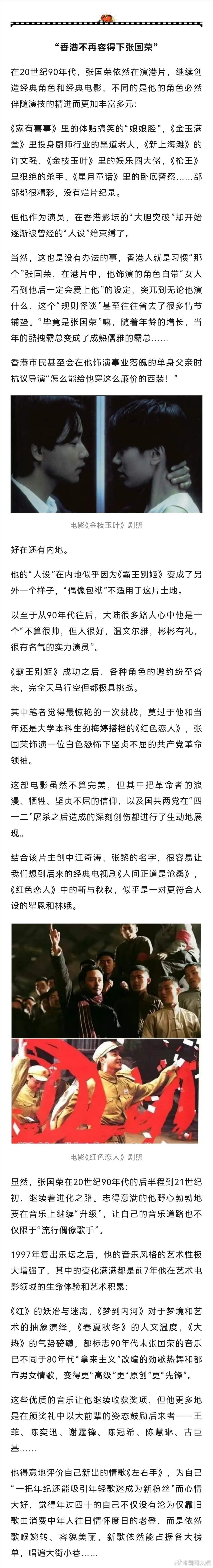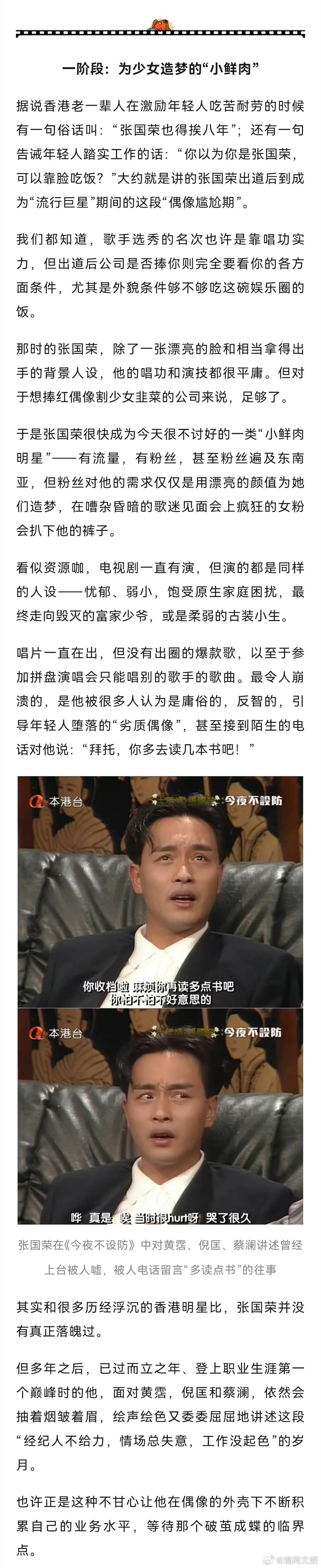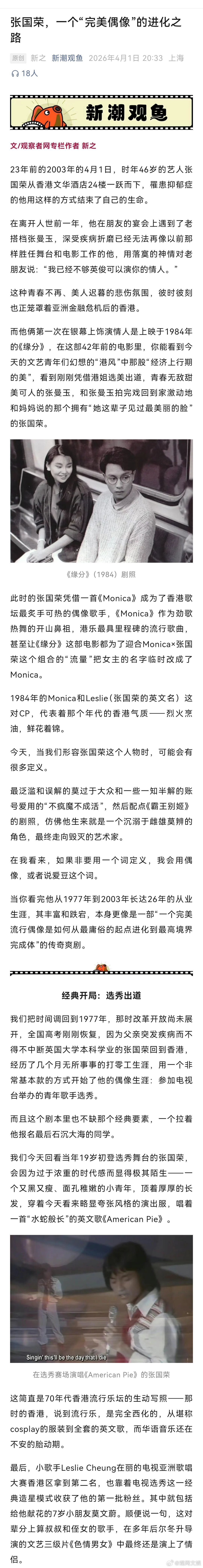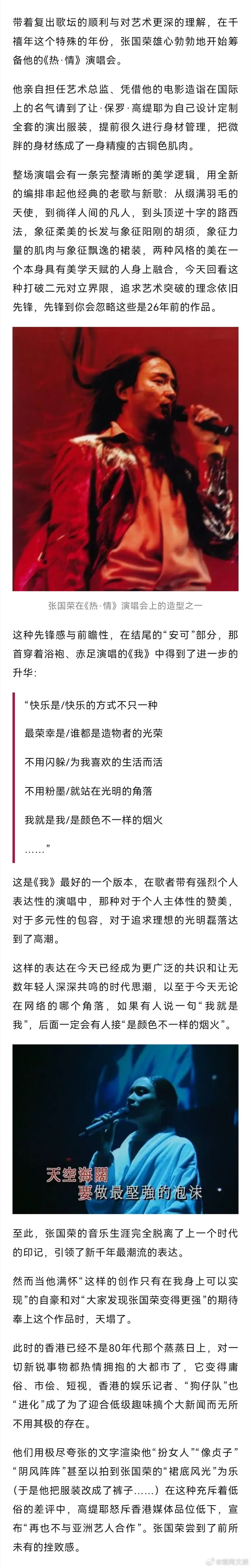【张国荣,一个“完美偶像”的进化之路 】完美偶像张国荣 新之:今天,当我们形容张国荣这个人物时,可能会有很多定义。最泛滥和误解的莫过于大众和一些一知半解的账号爱用的“不疯魔不成活”,然后配点《霸王别姬》的剧照,仿佛他生来就是一个沉溺于雌雄莫辨的角色,最终走向毁灭的艺术家。