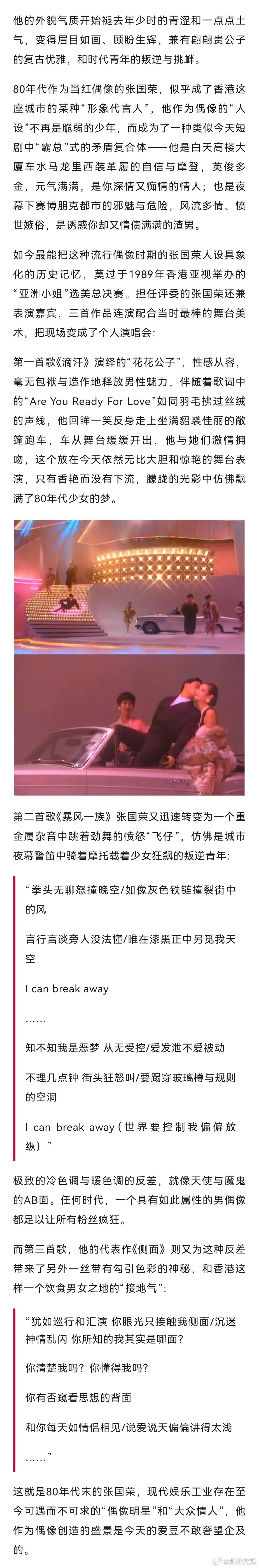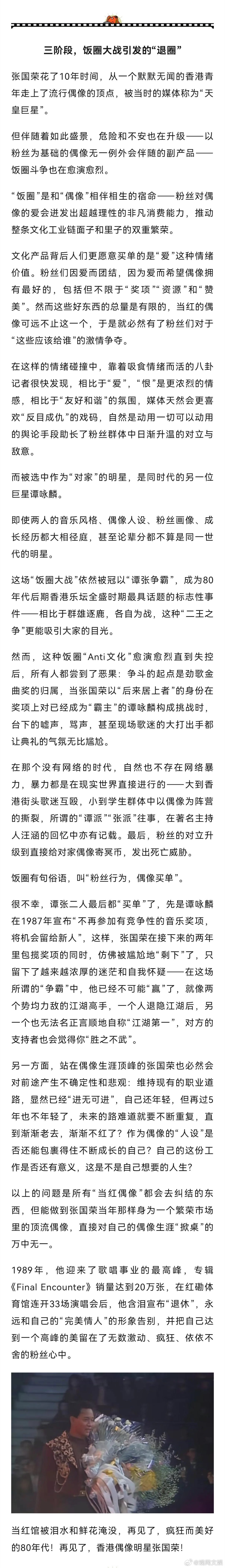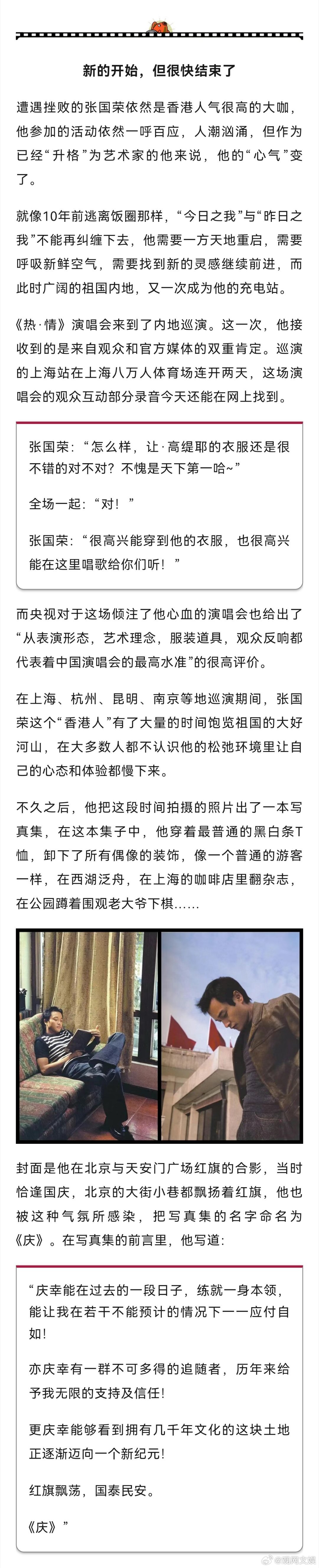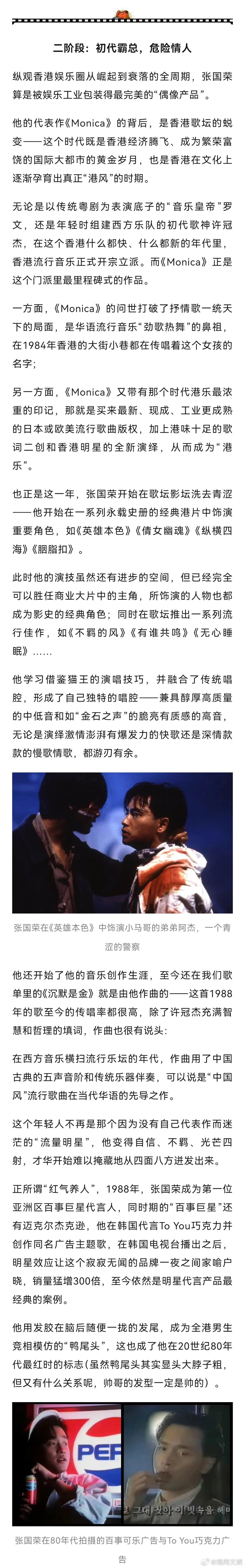 【张国荣,一个“完美偶像”的进化之路 】完美偶像张国荣 新之:今天,当我们形容张国荣这个人物时,可能会有很多定义。最泛滥和误解的莫过于大众和一些一知半解的账号爱用的“不疯魔不成活”,然后配点《霸王别姬》的剧照,仿佛他生来就是一个沉溺于雌雄莫辨的角色,最终走向毁灭的艺术家。