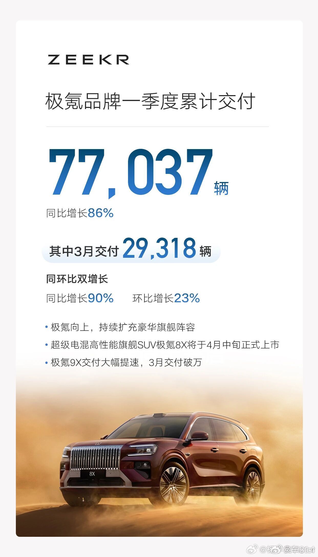 多家车企陆续公布了3月份战报!吉利的数据显示,3月份销量达到了23.3万辆,环比增长13%;同时也发布了今年第一季度的累计销量,达到了70.9万辆,创同期新高!从前几个月的情况就能看出来,吉利汽车现在的冲劲是真挺猛的,新能源车的占比狂飙到55%,油电两开花!极氪也成为当下最成功的的高端新势力品牌,3月交付近3万,同比暴涨90%,极氪9X与极氪8X形成搭配,对友商的市场形成了有力冲击。这还不到年中,吉利的势头就这么好了,全年的表现也更值得期待。吉利汽车3月销量233031辆吉利汽车一季度累计销量709358辆吉利汽车汽场全开新能源汽车极氪8X
