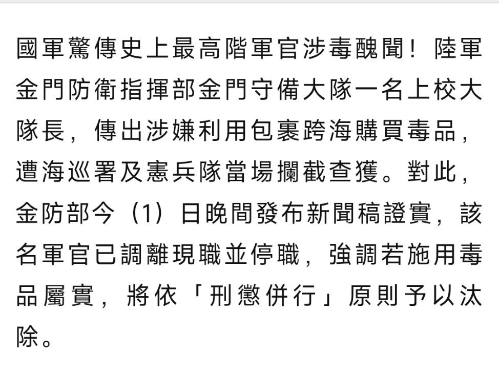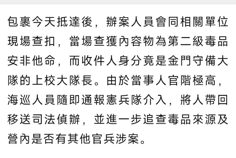 台海局势 台伪军金门防卫司令部金门守备大队的上校大队长涉毒被抓了从台湾本岛邮寄的包裹里搜出了安非他命,是个人才。