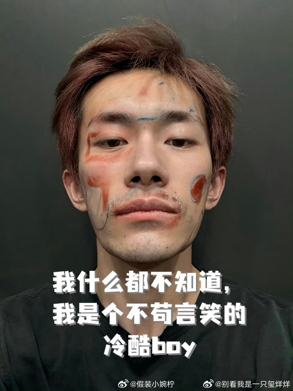 易烊千玺在个人网站突袭发布素颜自拍,脸上点缀彩色涂鸦,嘴角晕染的随意效果被调侃"