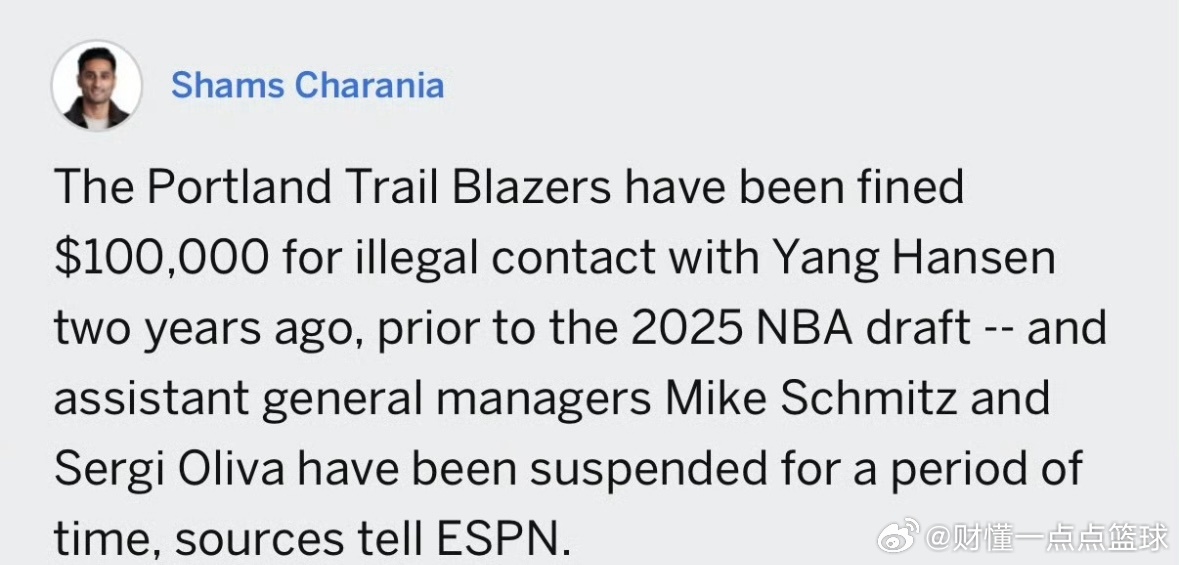 据Shams报道,开拓者因为2023年底(选秀前两年)非法接触杨瀚森,被NBA罚款10万美元,两名助理总经理施密茨、奥利瓦也被停职两周。这事以前还被当成“开拓者早就盯上杨瀚森、特别重视他”的依据来宣传。为啥现在才罚?很简单:当年违规是私下做的,联盟后来才查到、才官宣处罚。NBA规矩很严:没选秀资格的球员,球队不能提前私下接触。开拓者当年为了抢人先“下手”,现在东窗事发。对杨瀚森本人来说没什么影响,只是坐实:开拓者当年是真的很想要他,不惜违规;联盟的规则是不管过多久,查到就罚。中国男篮杨瀚森杨瀚森