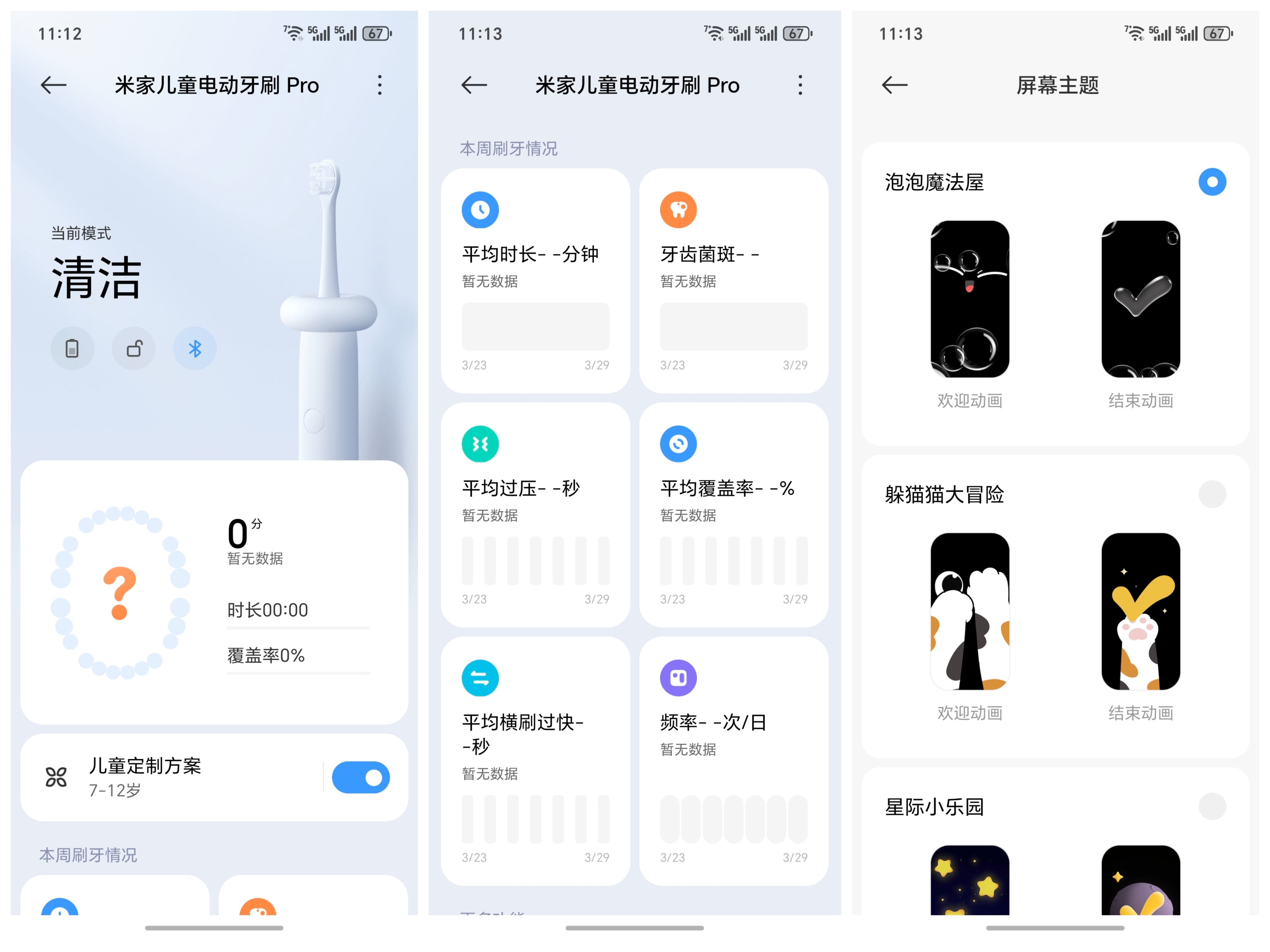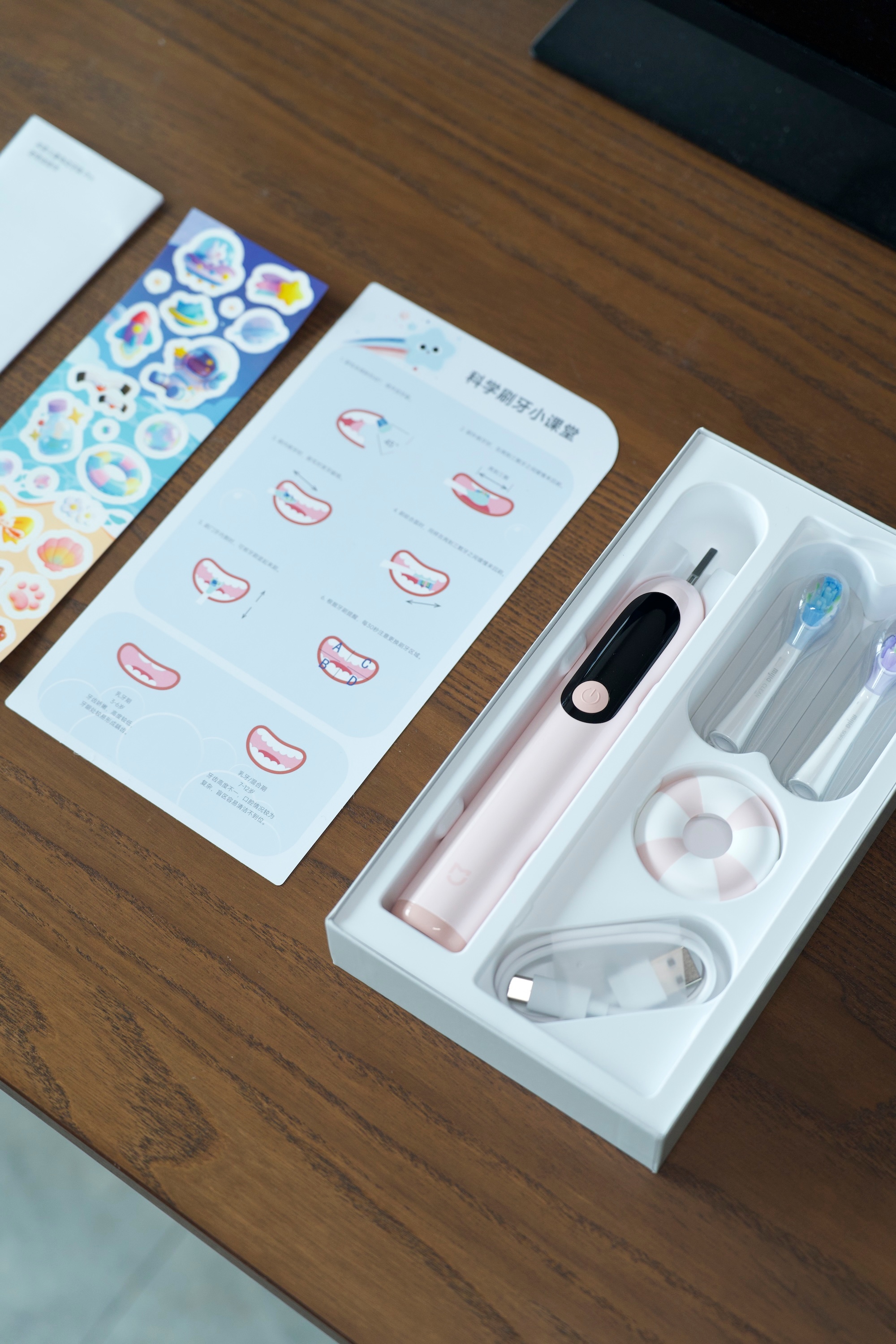 今年果冻也11岁了,刚换完恒牙,护牙正是关键期。之前刷牙总糊弄,死角刷不到,刷牙时间不够,盯着她刷牙属实费爹还不讨好,最近收到米家儿童电动牙刷Pro,这些痛点基本都解决了首先贴合换牙期口腔需求,它的软质小刷头不伤牙龈,能深入后槽牙贴合清洁,扫振设计能钻进牙缝清死角,含氟刷丝护新萌恒牙防蛀,97.55%菌斑清除率,清洁效果直观可见智能提醒特别实用,彩屏实时显示刷牙时长,每30秒语音提示换区,漏刷区域屏幕标橙,提醒主动补刷;力度过猛、横刷过快会红灯震动提醒,一段时间下来,横刷的毛病改了,刷牙姿势也越来越标准米家APP有7-12岁分龄模式,可定制洁牙方案,重点呵护恒牙和后槽牙,刷完生成清洁报告,时长、覆盖率一目了然,刷到100%覆盖率还会主动分享,刷牙的主动性明显提升趣味设计也很贴合孩子喜好,三个动画主题可切换,刷够2分钟有动画鼓励,搭配专属主题贴纸,DIY自己的专属款,刷牙完全不觉得枯燥。软胶防护圈能接住牙膏沫,不脏手也不会戳到喉咙,小朋友用着更安心全身防水可直接水洗,Type-C充电口,满电续航近3个月,外出还有旅行锁防误触;配呵护、清洁两款食品接触级刷头,可按需切换,替换也方便总结一下米家儿童电动牙刷Pro,从清洁逻辑到使用体验都很贴合换牙期孩子的需求,专业度在线,还能让孩子主动养成良好的刷牙习惯,换牙期护好恒牙,这笔投入很值米家儿童电动牙刷Pro