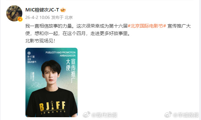 【#檀健次回应北影节新身份#】4月2日,官宣担任第十六届北京国际电影节宣传推广大使。继去年担任短片单元评委后,今年以新身份亮相的檀健次与大家相约北影节现场见,“我一直相信故事的力量。这次很荣幸成为第十六届北京国际电影节宣传推广大使,想和你一起,在这个四月,走进更多好故事里。” (现代快报)更多消息:#曝宋宁峰Q女士会面##卡琳娜站姐喊话浪姐管好工作人员##张婉婷 宋宁峰##齐溪在生日前一天和宋宁峰离婚##杨紫 没人通知我啊##北影节宣传推广大使檀健次#(编辑:惠天骄;审签:周乐瑞)