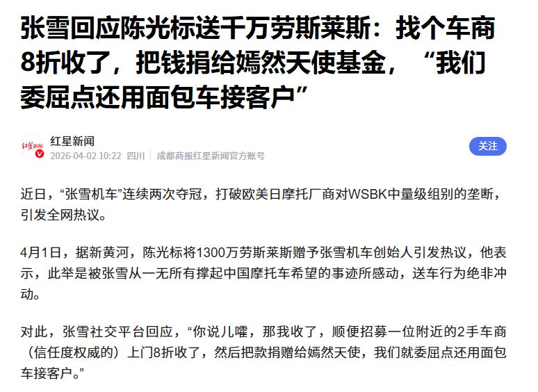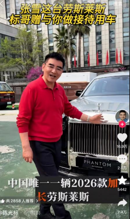 陈光标:赠予张雪一辆价值1300万的劳斯莱斯 据媒体报道,在张雪机车夺冠后,慈善家陈光标表示:“张雪,你好,我是陈光标,你太牛了,带着中国机车在世界顶级赛场连续拿了两个冠军,打破了国外几十年的垄断,这是咱们中国制造的骄傲,我看的热血沸腾,为了表彰你为国争光,做出贡献。标哥决定将公司刚刚购买了一部,中国唯一一辆2026款加长劳斯莱斯幻影,市场价1300万赠予给你,作为张雪老弟的接待用车。张雪,你是中国的英雄,期待你再创佳绩,让中国制造闪耀世界。” 除此以外,陈光标还向记者透露称,这辆劳斯莱斯目前已经运抵江苏,希望通过媒体的力量联系到张雪从而完成交付。
