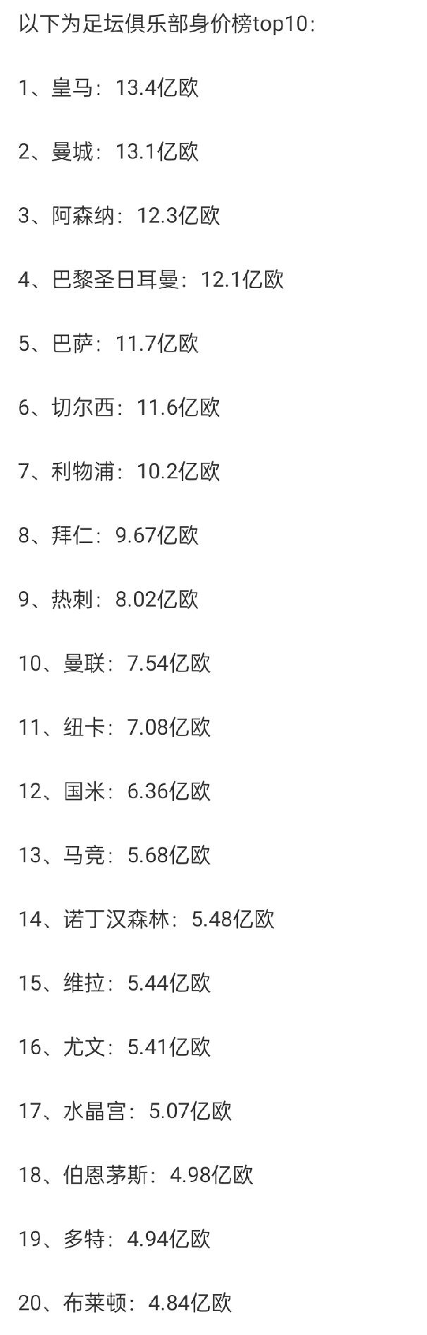 足坛俱乐部身价榜:皇马13.4亿欧居首,曼城、抢手、巴黎、巴萨前五 4月2日 德转公布了新一期俱乐部身价榜:皇马以13.4亿欧居首,曼城以13.1亿欧次之,阿森纳则以12.3亿欧位居第三,巴黎12.1亿欧第四,巴萨11.7亿欧第五
