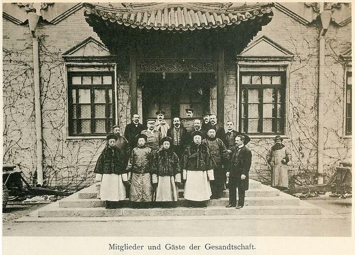 这是一张拍摄于1901年北京东交民巷德国公使馆,照片底部的德语标注 「Mitglieder und Gäste der Gesandtschaft」 意为「公使馆的成员与宾客」,合影中的载沣、载涛、载洵,是清末最后三年的实际掌权者,他们与瓦德西的会面,是满洲贵族向列强依附。 前排是清末最核心的宗室权贵载沣、载涛、载洵、顺承郡王讷勒赫;后排站着荫昌、八国联军总司令瓦德西、德国公使穆默、张翼,其余外方人员为德国公使馆馆员、德国军官、八国联军军官。