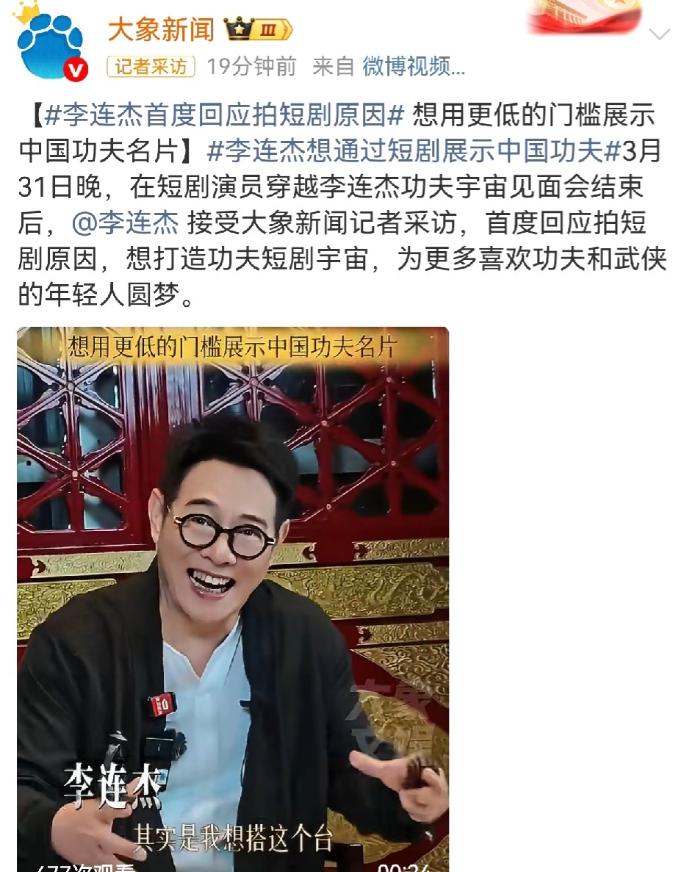李连杰,太刚了! 4月1日下午,功夫巨星李连杰,突然冲上了热搜,这次他完全不回避了,正面回应了他拍短剧不是为了赚钱,并说出了真正的原因迅速引发了网友的热议。   武侠迷心中的功夫天花板,63岁的李连杰,近期有了一个让全网意外的举动——涉足短剧领域。   随着武侠短剧《源力江湖》开机现场照片流出,这位撑起华语动作片半壁江山的巨星,以全新的姿态出现在公众视野里。   照片中,他一身古装,头上裹着布巾,眉眼间虽添了几分苍老,精气神却依旧十足;另一张开机图里,他身着黑外套、戴着墨镜,双手合十,被一群人簇拥在中间,气场丝毫未减。   放在以往,没人会把李连杰和短剧联系在一起。   他塑造的觉远、黄飞鸿、方世玉等经典角色,早已刻进几代人的青春里,作为国际功夫巨星,他身家丰厚,无需为了名利去涉足门槛相对较低的短剧领域。   也正因为如此,当他要拍短剧的消息传开后,外界的质疑声从未停止,不少人直言,他这是在“捞快钱”,毕竟以他的地位,完全没必要放下身段,去参与短剧拍摄。   这种质疑声持续了一段时间,直到4月1日下午,李连杰突然冲上热搜,这次他完全不回避了,正面回应了他拍短剧不是为了赚钱,并说出了真正的原因迅速引发了网友的热议。   这份直面质疑的坦荡,恰恰体现了他作为功夫传承者的底气,没有丝毫明星的架子,只有一份纯粹的责任与热爱。   外界的猜测并非毫无道理,当下影视行业环境发生了巨大变化,长剧市场不景气,短剧却凭借传播快、门槛低的特点,占据了不小的市场份额。   不少网友看到李连杰出现在短剧开机现场,纷纷惊呼不敢相信,感慨影视寒冬之下,连元老级别的功夫巨星都要“下凡”拍短剧;但也有一部分网友表示理解,认为短剧只是一种新的传播载体,李连杰的尝试,既是顺应市场的选择,也是给功夫传播开辟新路径。   没人知道,李连杰的这个决定,藏着他多年的遗憾与心愿。   早年间,《少林寺》一部剧火遍全国,让无数人爱上了中国武术,可他却一直遗憾,那些苦练功夫的年轻人,始终缺少一个展示自己的平台。   在他心中,功夫从来都不只是自己的立身之本,更是中国最珍贵的文化名片,这份文化瑰宝,需要有人守护,更需要有人传承。   选择短剧,对李连杰来说,从来都不是妥协,而是经过深思熟虑的选择。   他清楚地知道,短剧门槛远低于大电影,传播速度又快,更贴近当下的年轻人,正好能让那些怀揣武侠梦、苦练真功夫却无处施展的年轻人,有一个登台亮相的机会。   他真正想做的,不是自己再当一次银幕主角,而是搭建一个“功夫短剧宇宙”的平台,做年轻人的“造梦者”,托举更多后来人。   这份初心,从来都不是口头说说,李连杰用实际行动证明了自己的诚意。   据悉,他此次参与短剧拍摄,不仅不担任主角,甘愿做一片“绿叶”,更是零片酬出演,甚至自掏腰包扶持新人。   这种不为名利、只为传承的举动,和当下不少只顾捞金的艺人形成了鲜明对比,也让此前的质疑声不攻自破。   很多人说,李连杰老了,打不动了,才会退居幕后拍短剧。   可事实上,在近期流出的拍摄花絮里,他一招一式依旧干净利落,和年轻演员对戏时,风采不减当年。   他之所以选择退居幕后,不是能力不足,而是不想再占据舞台的中心,只想把更多机会留给年轻人,让他们有机会展示真功夫,传承武侠精神。   4月1日的热搜,让更多人读懂了李连杰的用心。   他不是在拍一部简单的短剧,而是在为中国功夫的传承开辟一条新的道路,用年轻人喜欢的方式,让真功夫走出小众圈子,被更多人看见、了解和喜爱。   这份格局,不是刻意标榜,而是刻在骨子里的责任与热爱。   网友的热议,从来都不是单纯的好奇,更多的是认可与敬佩。   有人说,杰哥这哪里是拍短剧,分明是在为中国功夫的传承铺路;也有人表示,看到李连杰这样的巨星甘愿托举新人,才明白真正的热爱,从来都不是自己站在顶峰,而是让更多人有机会站上顶峰。   大家期待的,不仅是李连杰的短剧作品,更是那些被他扶持的年轻人,能带着中国功夫的火种,继续前行。   如今,李连杰的短剧拍摄正在稳步推进,除了《源力江湖》,他还将参与另一部武侠短剧《剑归》的拍摄。   他用自己的影响力,给短剧市场注入了新的活力,也让更多人看到了功夫传承的新可能。   或许有人依然会有疑问,但不可否认的是,李连杰用自己的方式,践行着对功夫的热爱与责任,这份初心,值得每一个人尊重。   如果各位看官老爷们已经选择阅读了此文,麻烦您点一下关注,既方便您进行讨论和分享,又能给带来不一样的参与感,感谢各位看官老爷们的支持!