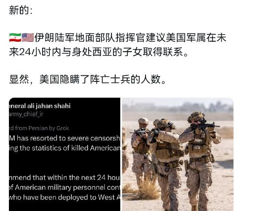 侮辱性极强!伊朗喊话美军家属!4月1日,根据外媒报道,伊朗陆军地面部队指挥官喊话美军家属称,建议他们在未来24小时内与他们在西亚的孩子联系。显然,这番看似平静的提醒,背后指向的,就是伊朗已经确认美军遭到的伤亡,比想象中的更多。 所谓“建议联系”,潜台词再清晰不过:等美国消息瞒不住、遗体运回国内时,再联系就晚了。作为家属,你们最好是确认一下自己的儿子,丈夫,或者孩子的父亲,还是不是活着。事实上,美以伊三国战争以来,公开报道的信息,最起码就有三次显示美国可能出现了重大伤亡。 伊朗陆军地面部队指挥官阿里·贾汉沙希在4月1日的公开喊话中没有使用任何激烈措辞,他只是以中立语气向美军家属发出24小时联系提醒。 伊朗方面已经通过情报渠道掌握美军在西亚的真实伤亡数据,这个数据远超美国中央司令部对外公布的数字。美国军方长期以来对中东战事的人员损失进行严格管控,他们试图用有限的公开数据稳定国内舆论,掩盖前线的真实困境。 美军在西亚的军事部署覆盖七个国家,这些国家境内的十七处美军基地先后遭遇伊朗导弹与无人机打击。 公开报道第一次显示美军重大伤亡的节点出现在战争初期,伊朗发动首轮大规模报复袭击时,美军中央司令部曾短暂披露超过两百名士兵受伤,其中十人重伤,这一数据已经暴露美军前线的严重损失。 美国媒体随后跟进报道,确认这些受伤士兵中超过七成患上创伤性脑损伤,这种由爆炸冲击波造成的隐形伤害会给士兵带来长期后遗症。 第二次公开暴露美军伤亡问题的事件发生在战争中期,伊朗导弹精准击中美军在沙特的一处隐蔽据点。当时外界普遍认为美军会继续隐瞒伤亡情况,结果以色列方面率先发布消息,称这次袭击造成十二名美军士兵受伤,其中两人重伤。 美军中央司令部不得不随后证实该事件,承认沙特基地遇袭带来的人员损失,这一细节打破了美国军方试图维持的伤亡数据平衡。 第三次公开显示美军重大伤亡的事件来自伊朗对美军在迪拜藏身处的打击行动。伊朗方面明确宣称这次打击造成约百名美军死亡,两百至三百名美军受伤,藏匿在该据点的美军几乎折损过半。 美军中央司令部第一时间发布澄清声明,声称没有美方人员在迪拜遇袭,但卫星图像随后曝光该据点被完全摧毁的画面,现场有多架加油机被毁,这与美军的否认形成鲜明矛盾。 美国军方持续瞒报伤亡数据的行为背后存在明确动机。美国国内对中东战争的支持度正在下降,持续攀升的人员伤亡会引发国内舆论反弹,影响政府的支持率。 美军还担心公开真实伤亡数据会动摇前线士兵的士气,削弱美国在中东地区的军事威慑力。此外,美国试图通过隐瞒伤亡来维持与以色列的军事同盟,避免因人员损失引发盟友间的连锁反应。 伊朗方面掌握美军伤亡的真实情况,这并非凭空猜测。伊朗拥有完善的情报网络,能够实时监控美军在西亚的动态,包括基地部署、人员调动和伤亡情况。 伊朗军方通过多渠道验证美军伤亡数据,确保信息的准确性,这也是伊朗指挥官敢直接向美军家属喊话的底气。伊朗的目的不仅是揭露美国的瞒报行为,更是向美国传递明确信号:伊朗有能力持续打击美军,美国无法掩盖战争带来的人员代价。 美军家属在收到伊朗的提醒后陷入两难境地。他们既希望通过官方渠道确认亲人的安危,又担心美国军方继续隐瞒真相,导致自己错过与亲人最后的联系机会。 部分美军家属已经通过社交媒体发起请愿,要求美国中央司令部公开真实的伤亡数据,保障家属的知情权。美国国内的舆论压力正在不断升级,越来越多的民众要求政府结束中东战争,将士兵撤回国内。 伊朗向美军家属发出的提醒,是一场没有硝烟的信息战。伊朗通过这种方式揭露美国的瞒报行为,争取国际社会的支持,同时动摇美国国内的战争支持基础。美军家属的反应和国内舆论的走向,将对美国的中东政策产生重要影响。美国军方若继续隐瞒伤亡数据,可能会引发更严重的信任危机,甚至影响美国在全球的军事同盟体系。 这场战争的影响还在持续扩散,全球能源市场、国际贸易和地区安全格局都受到深刻影响。美国需要重新评估其中东战略,避免陷入不必要的战争泥潭。国际社会也应该发挥积极作用,推动各方通过对话协商解决分歧,维护中东地区的和平与稳定。只有这样,才能避免更多无辜民众陷入战争的苦难,让地区局势回归正常轨道。
