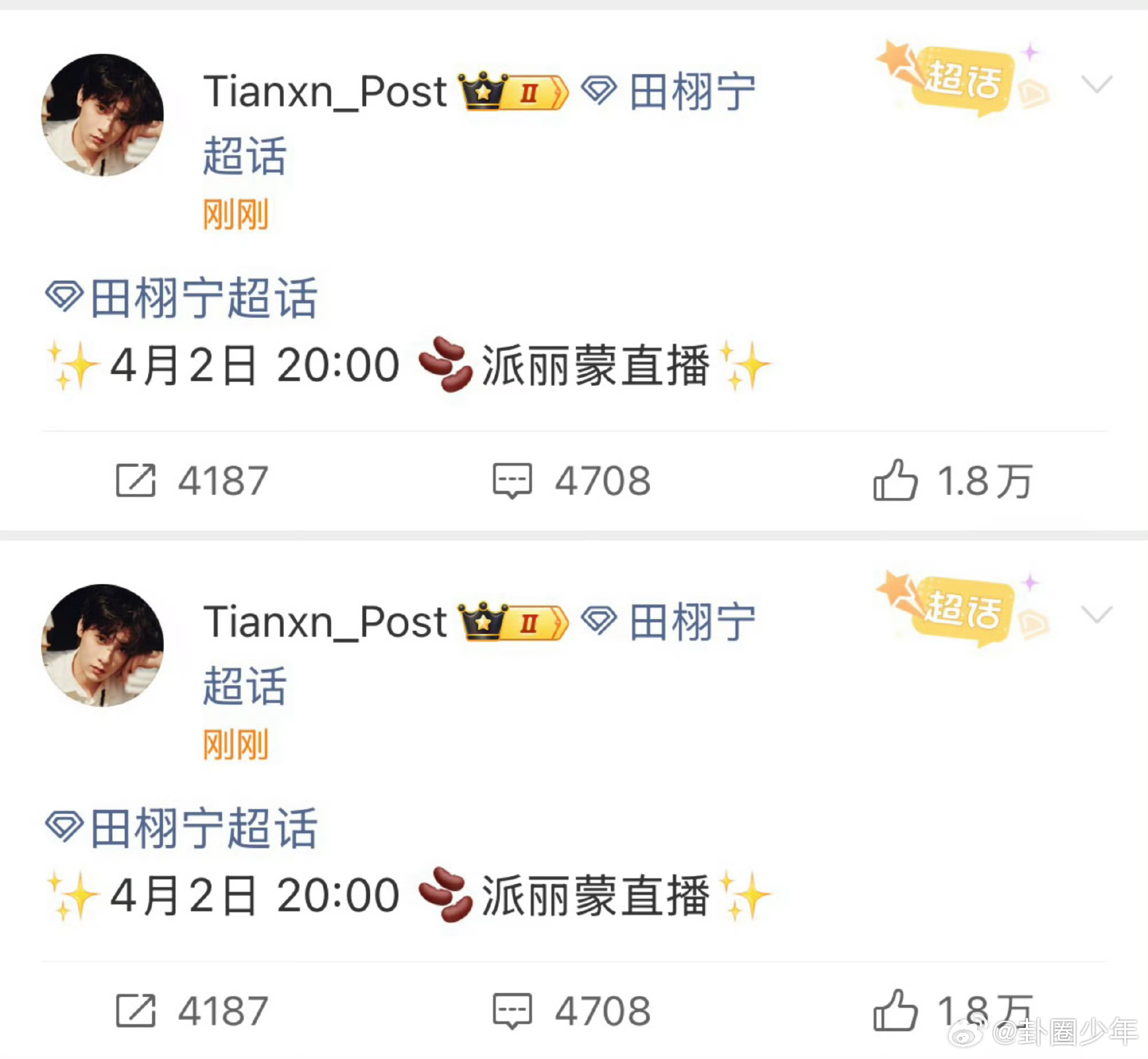 田栩宁千架无人机应援田栩宁今晚有千架无人机应援以夜空为幕,以无人机为笔,为田栩宁献上专属浪漫,这份应援又燃又暖心。