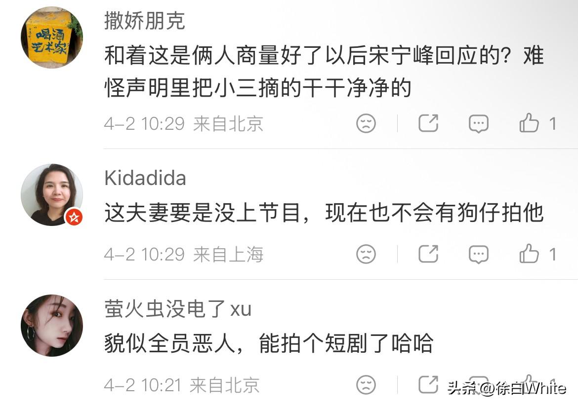 4月2日,娱记拍到宋宁峰承认出轨公开道歉前,还与第三方深夜见面,两人先聊天,再吃饭,再聊天,在车里从凌晨聊到天亮! 也就是说,张婉婷想出来处理第三方的方式是公开宋宁峰跟第三方出轨的事实,把这件事摆在明面上处理,宋宁峰是知情的,并特意去找第三方沟通做工作,避免第三方线上锤他,彻夜长谈的结果就是,宋宁峰单方面完成了出轨后的所有线上公关流程,第三方没有加入,目前顺利完成了出轨后的一切收尾,我猜,可能半年或者一年后,宋宁峰就会以自己全面康复为理由,恳请大家给他一个机会,紧接着重新开始工作……毕竟他的道歉长文写的是暂退……