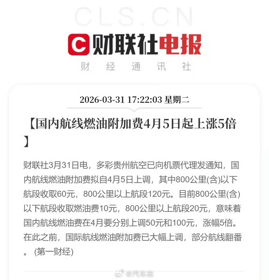 国内航线燃油费上涨5倍4月5号起买机票贵不少,800公里以上国内航线从20元增至120元,800公里以下航线从10元增至60元。