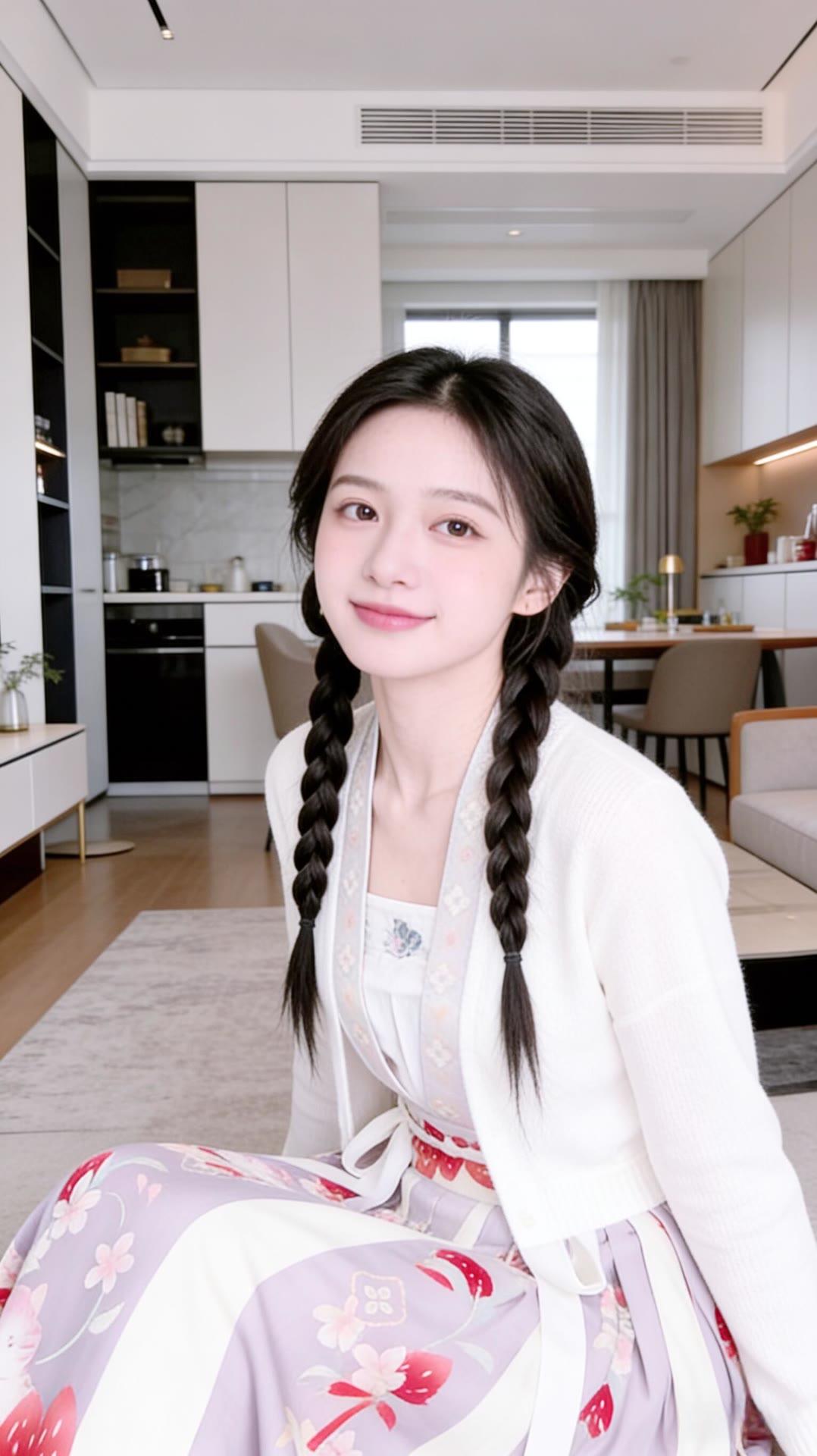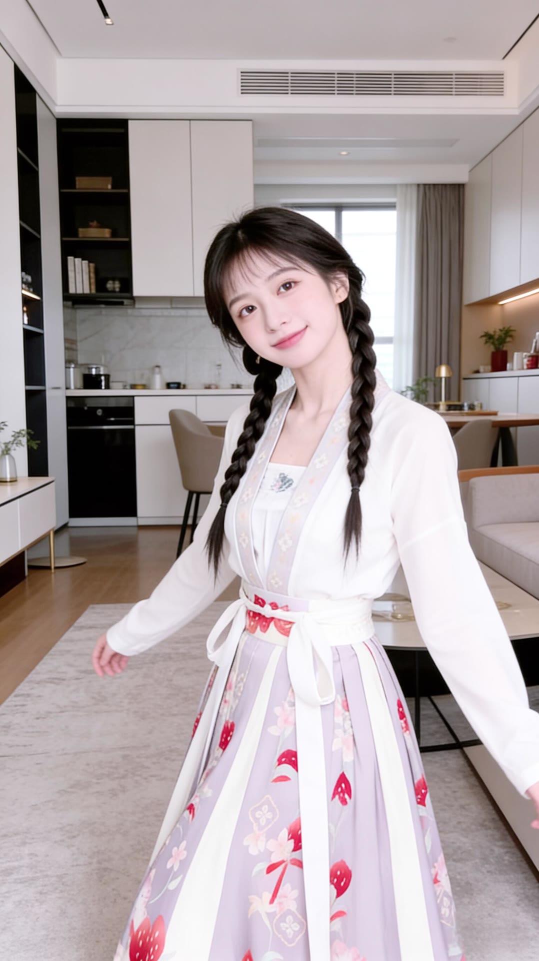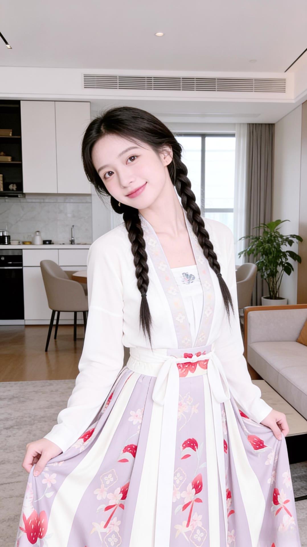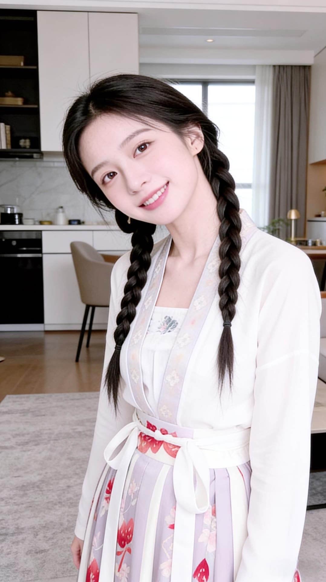 甜美少女风,白色连衣裙搭配花边装饰,厨房背景温馨舒适。