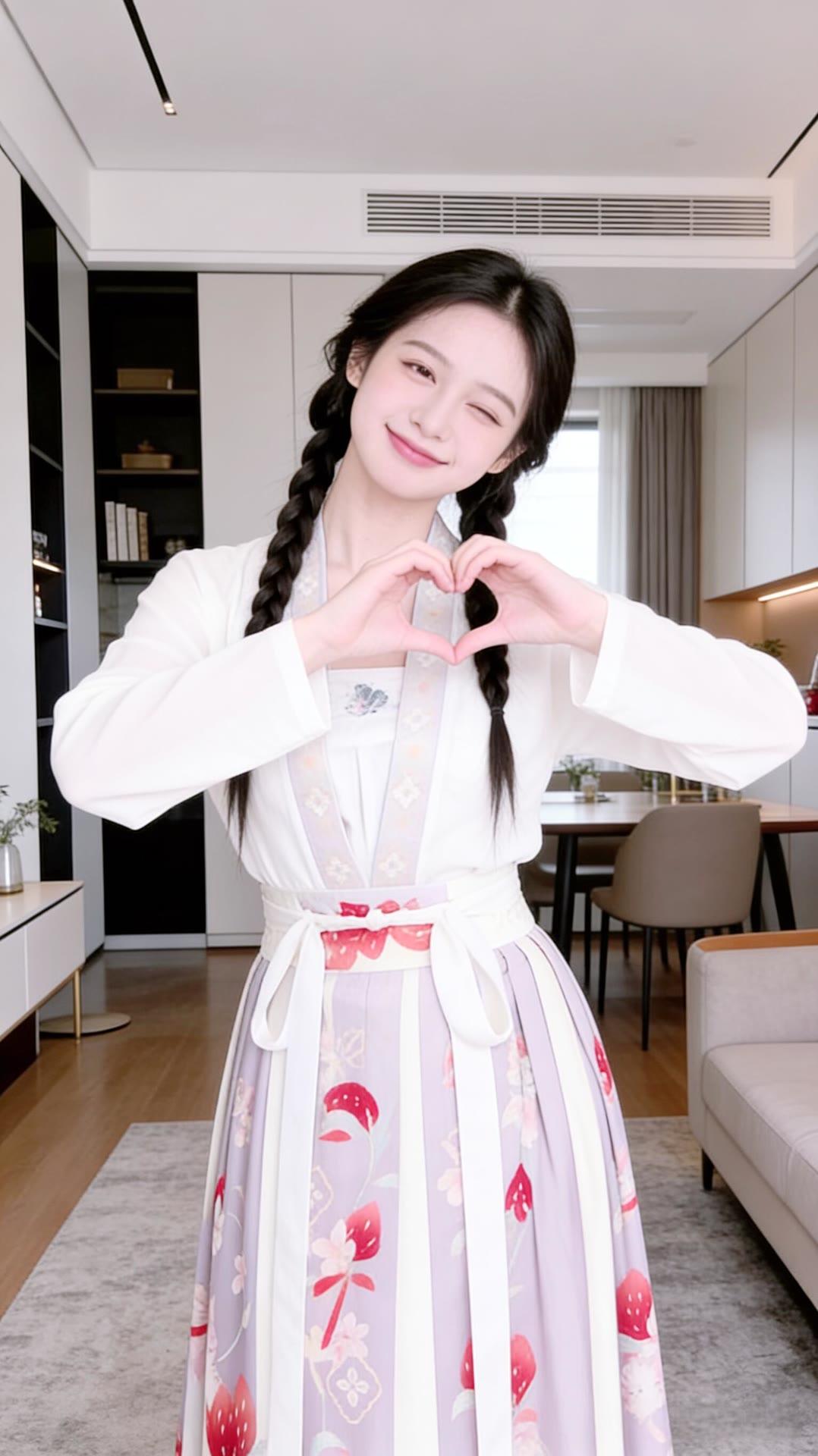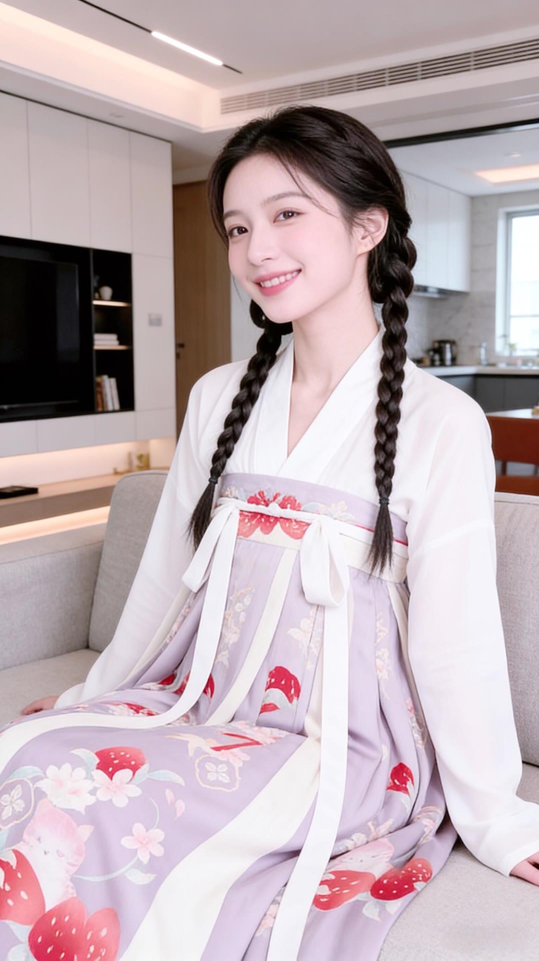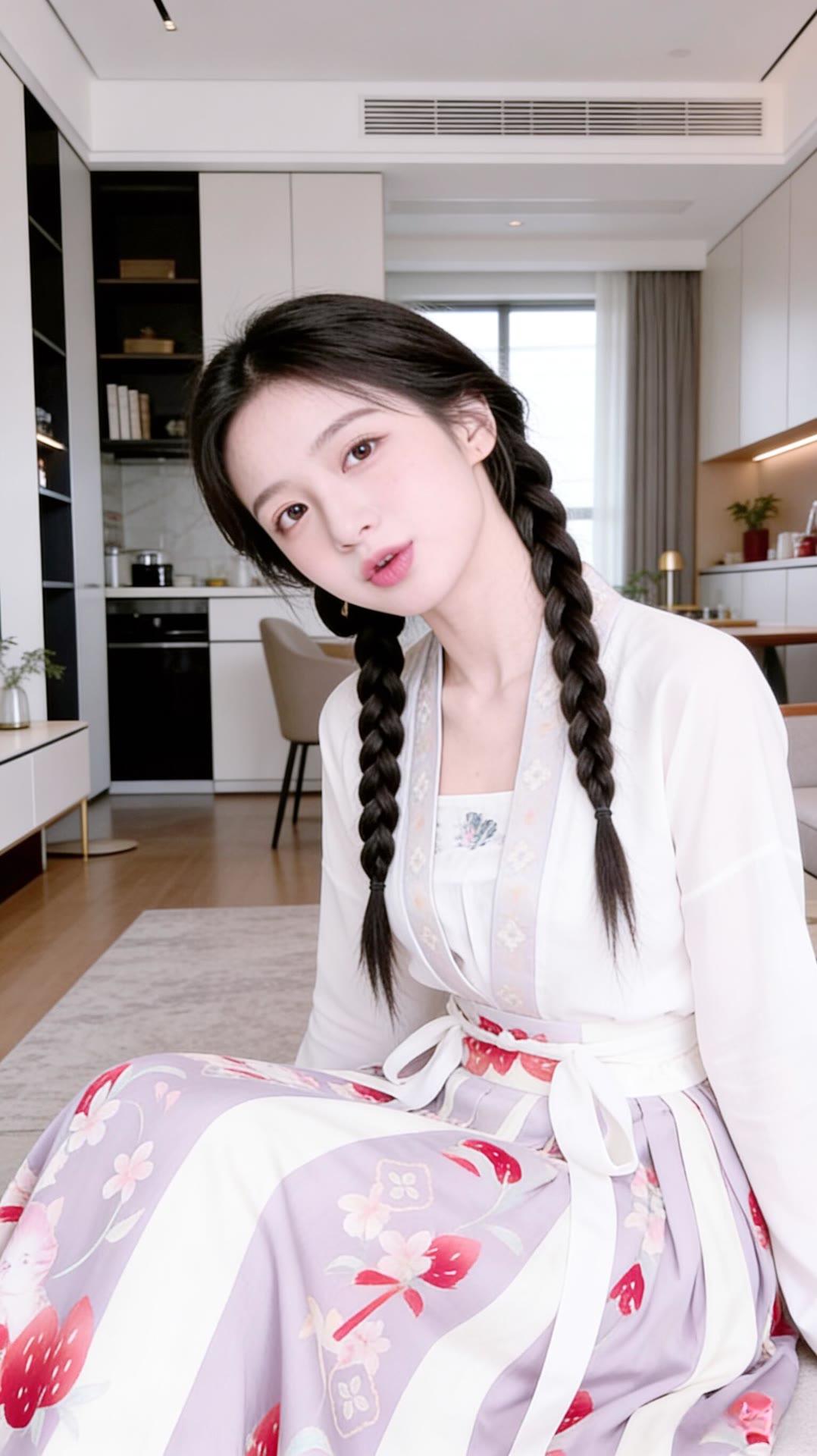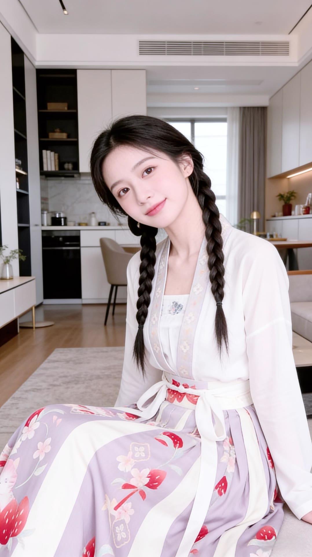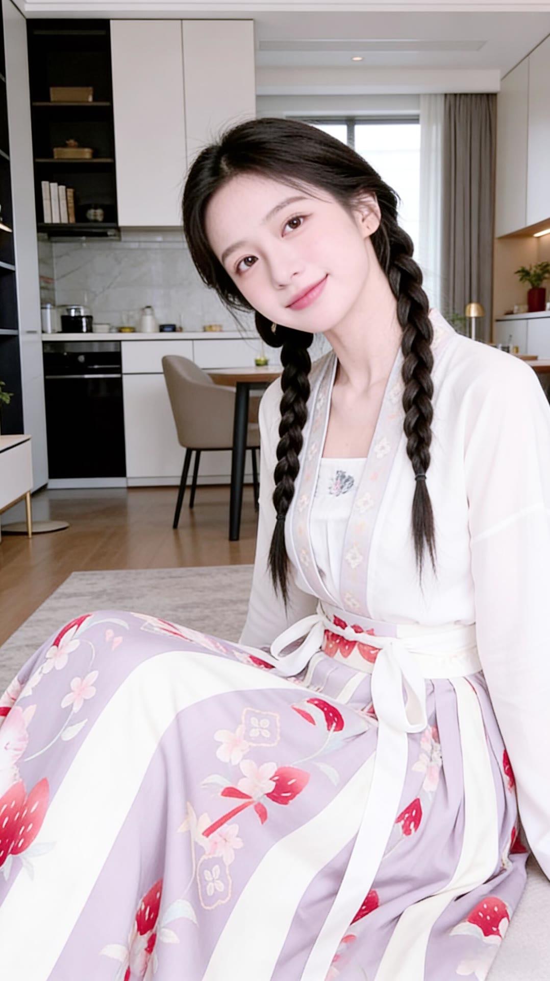 甜美少女风,白色连衣裙搭配花边装饰,厨房背景温馨舒适。